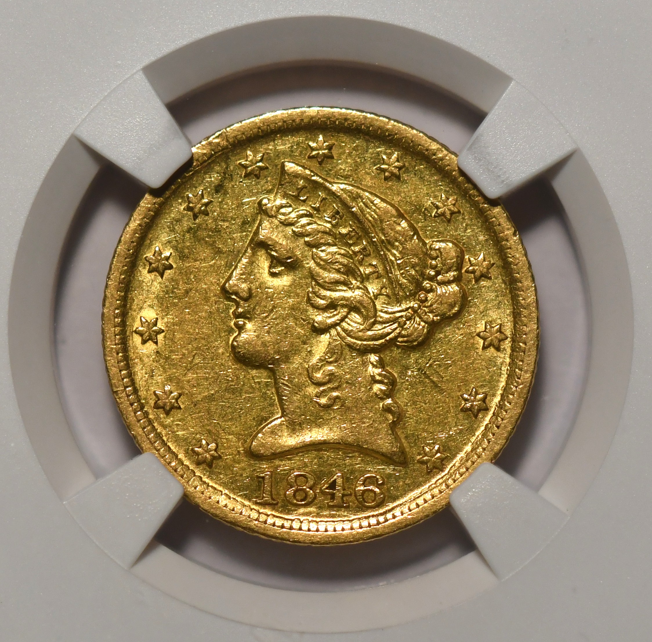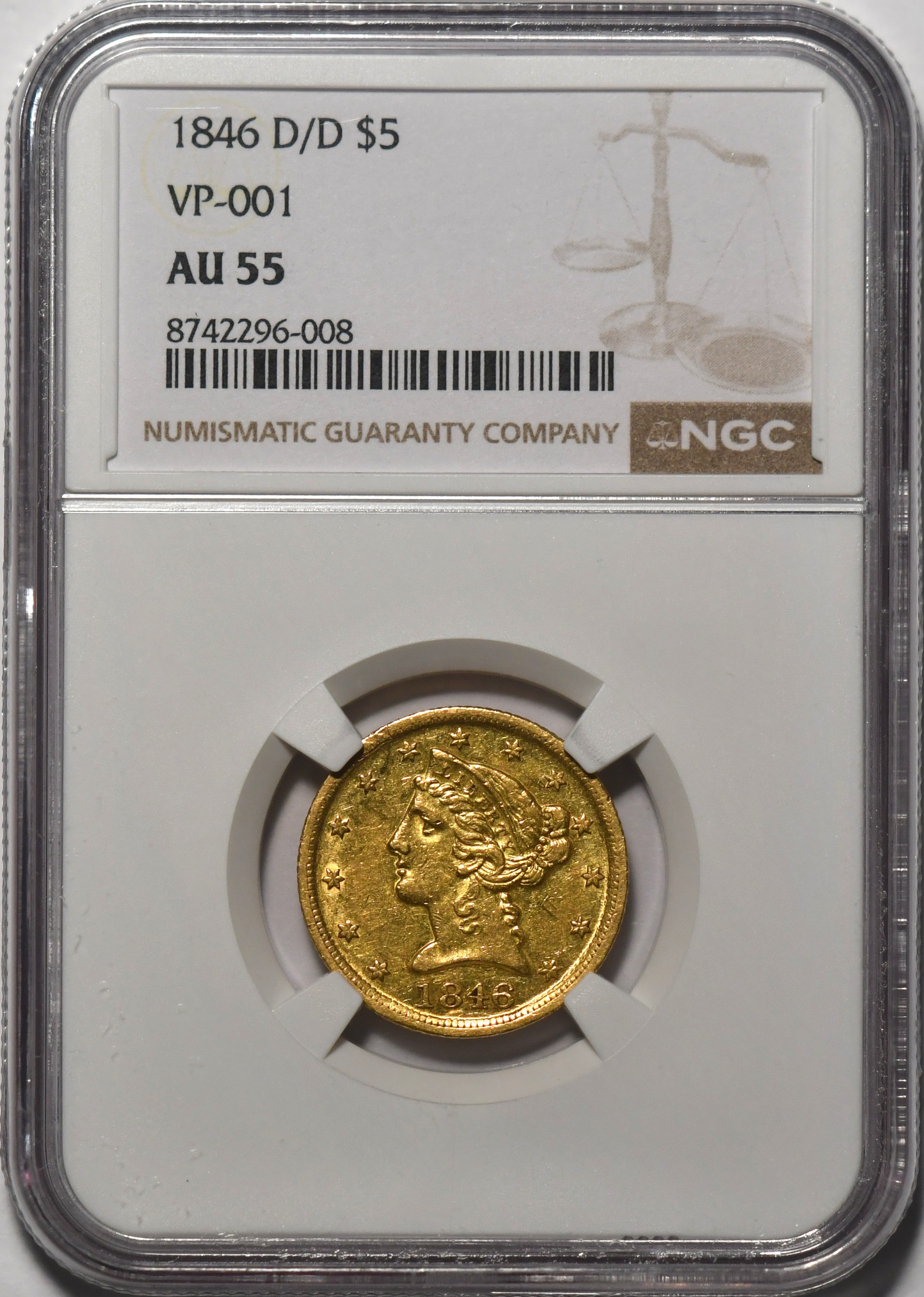 1846-D/D $5 NGC AU55 VP-001. Popular over-mintmark issue, wholesome and great eye appeal. PCGS: $9000