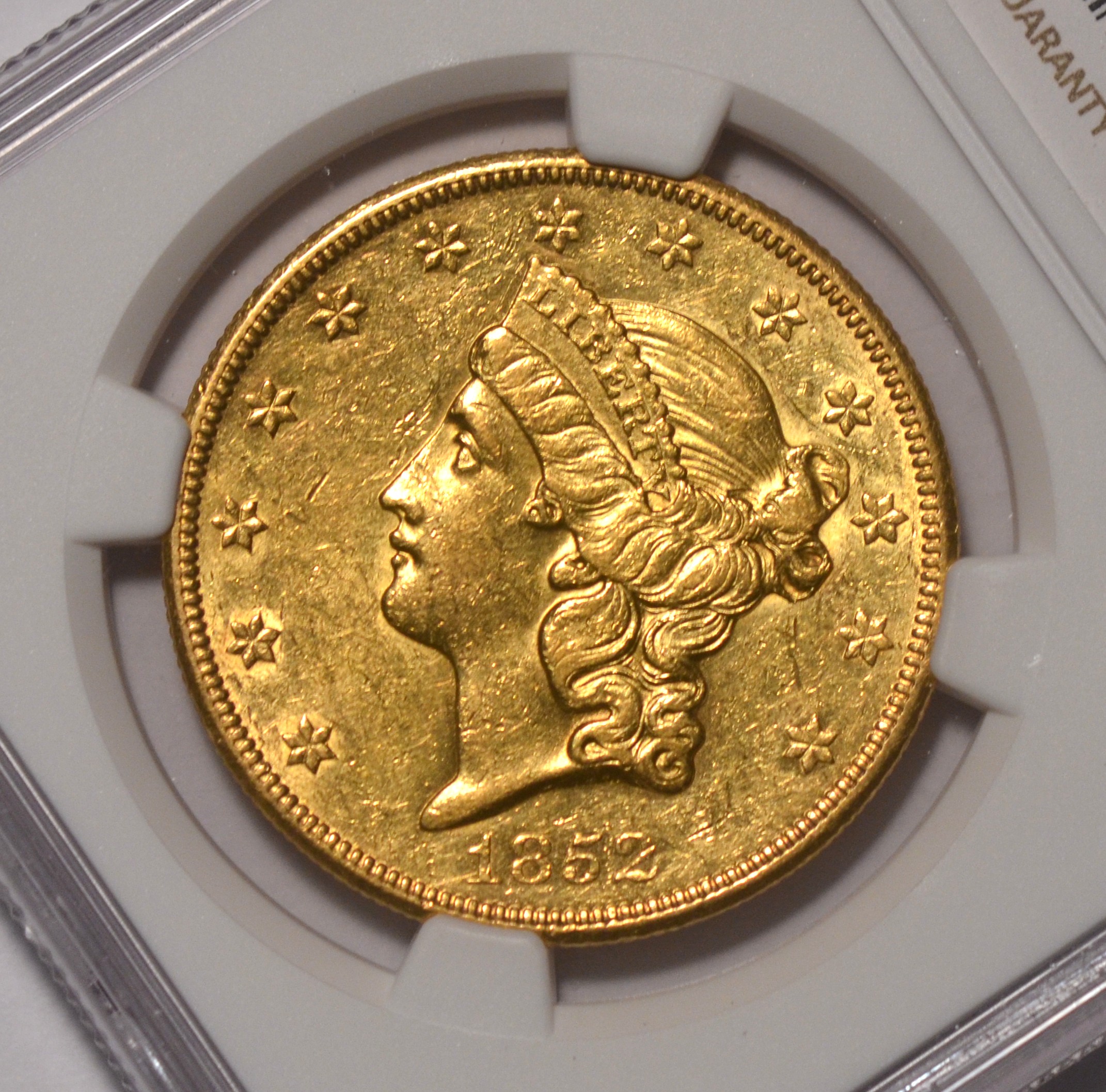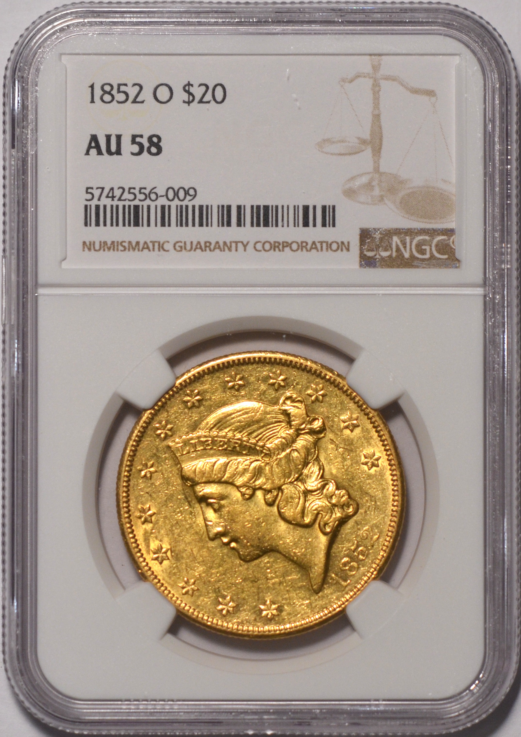 1852-O $20 NGC AU58 Boldly struck & lustrous early Type 1 double eagle from New Orleans. PCGS shows $15,500.00