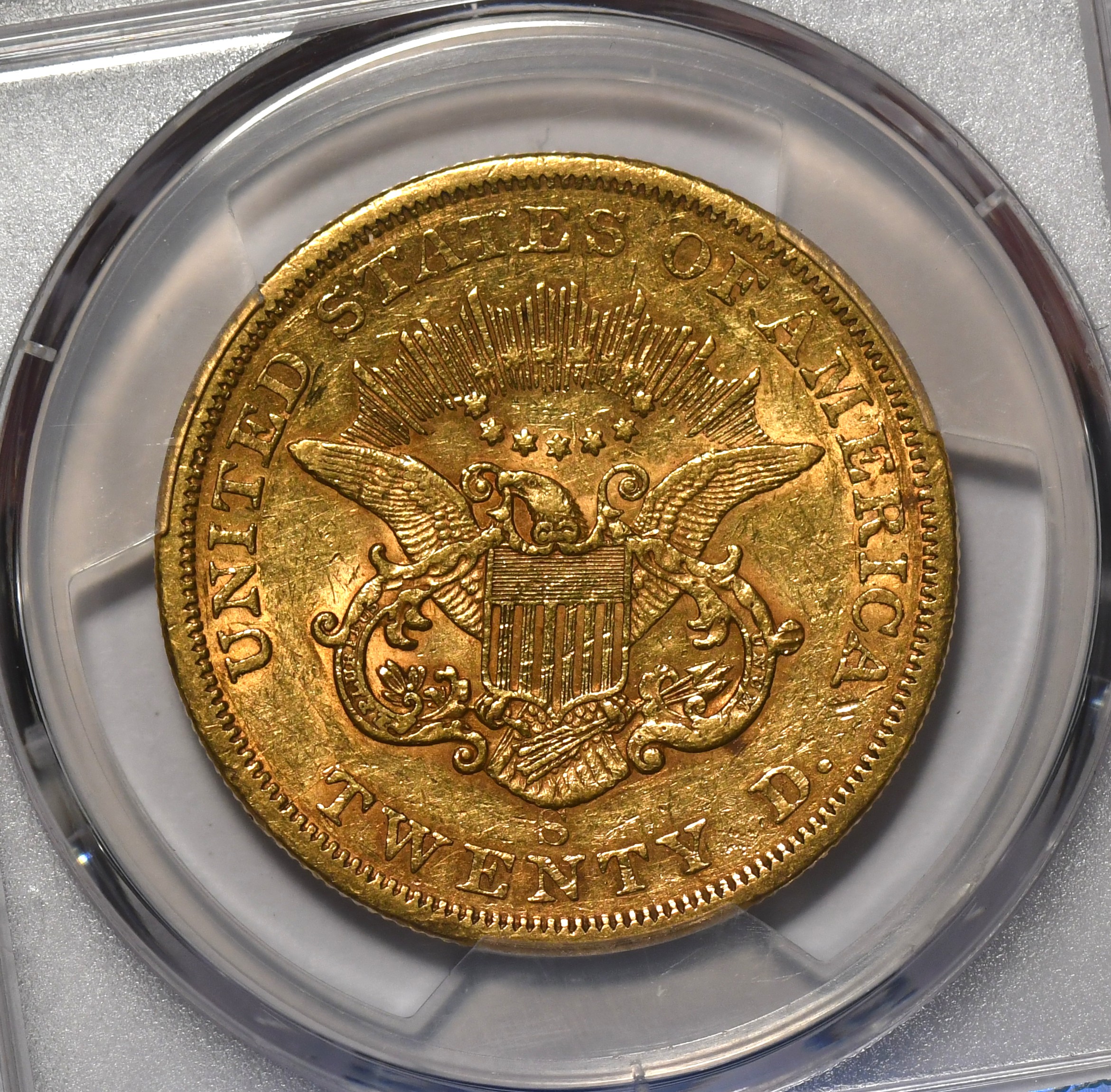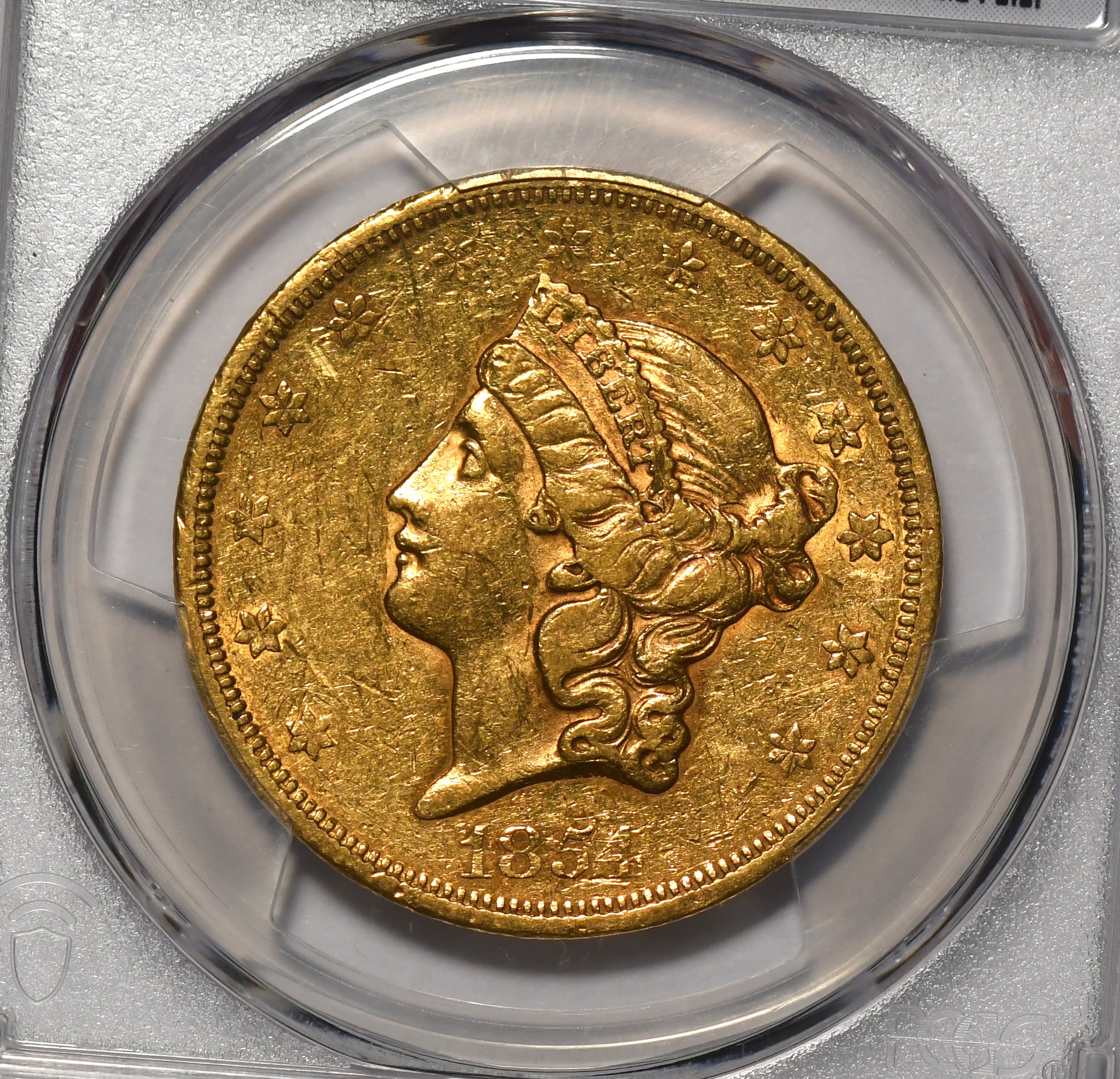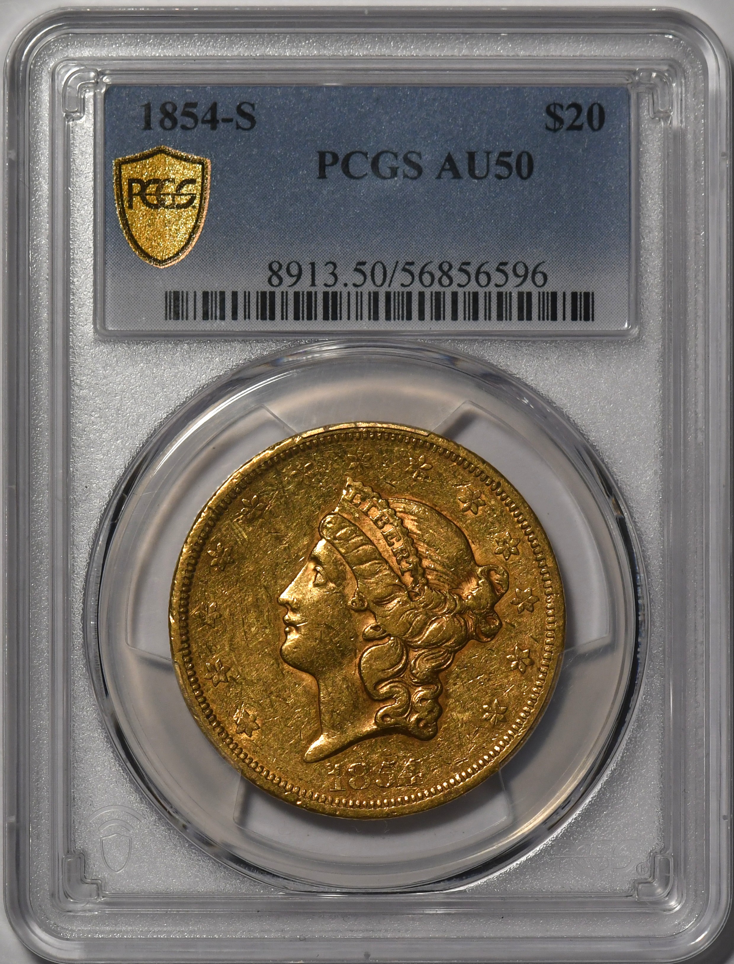 1854-S $20 PCGS AU50 1st year of issue at SF mint. PCGS shows $16,000.