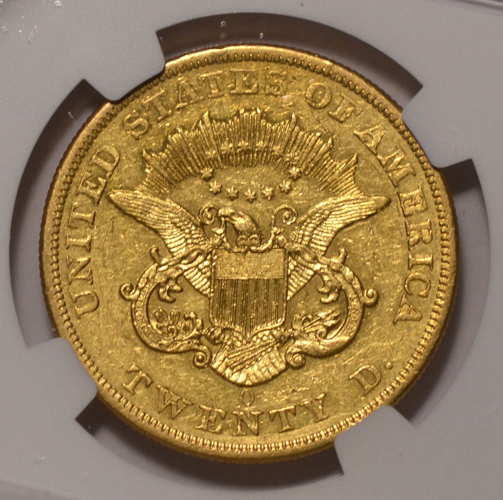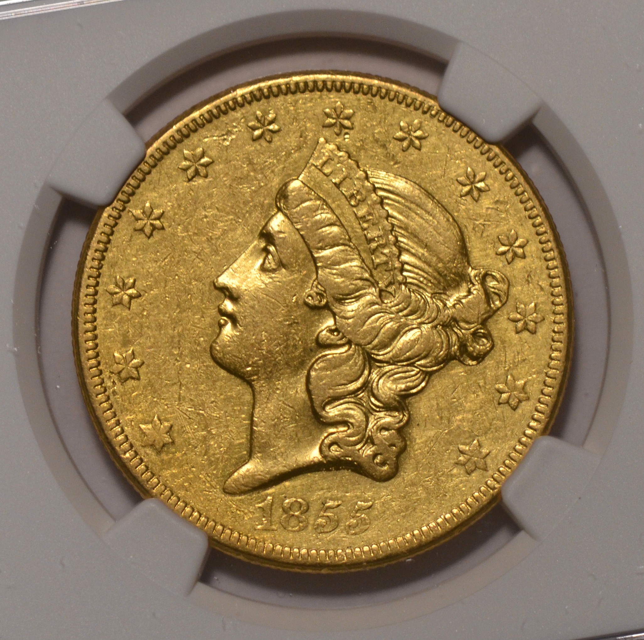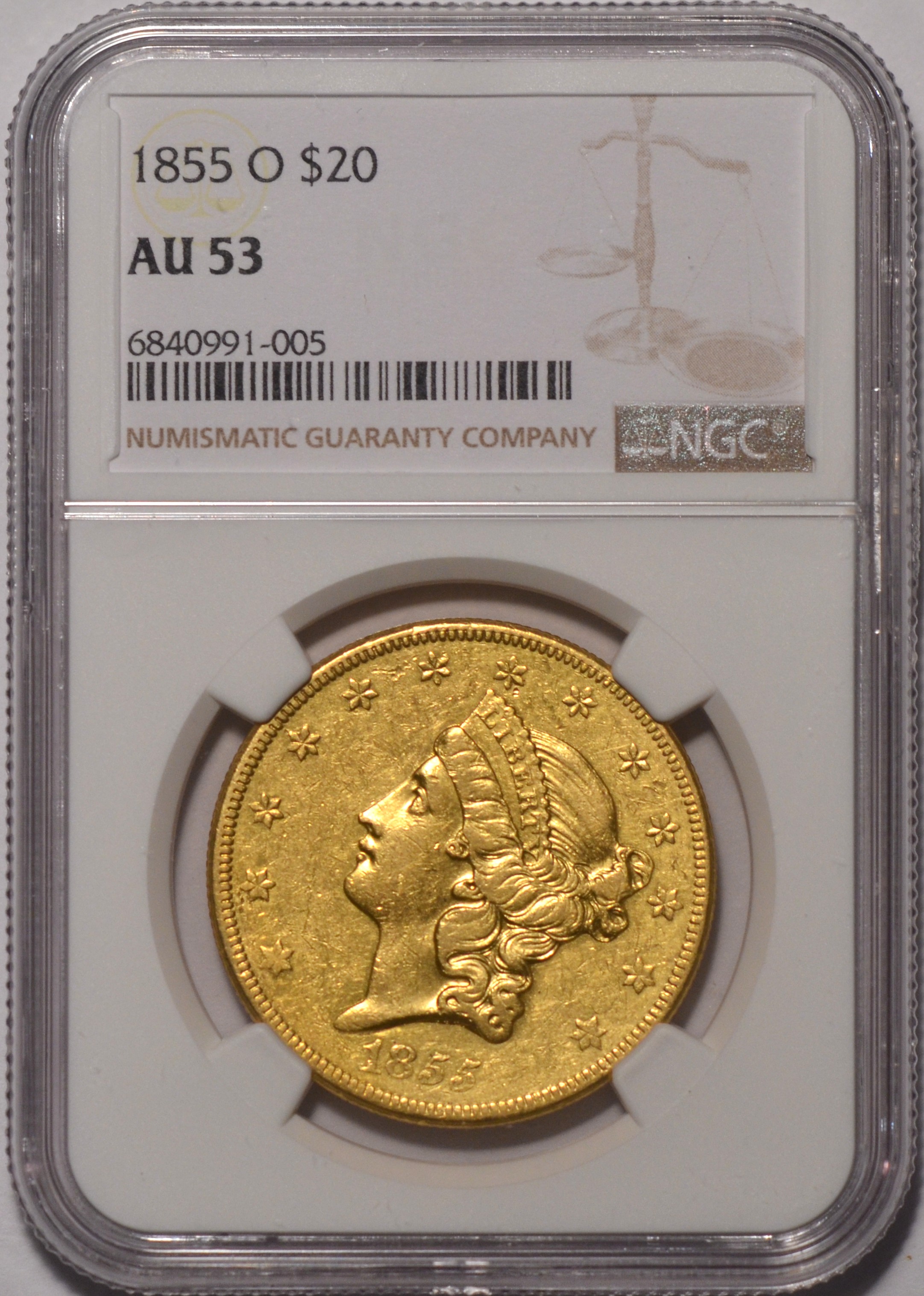1855-O $20 NGC AU53 One of the great rarities in the entire Liberty double eagle series and one of the toughest New Orleans Mint made double eagles especially in about uncirculated condition. The 3rd-rarest New Orleans-minted Double Eagle. Bid (5055)=40,00060,000. NGC60,000. PCGS65,000.