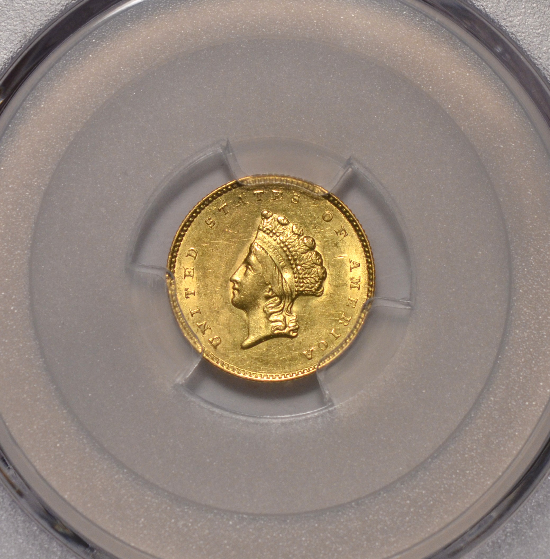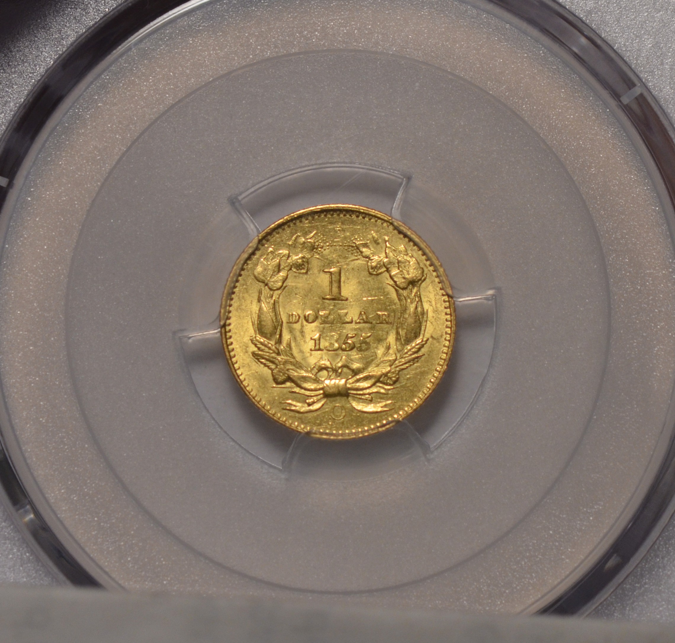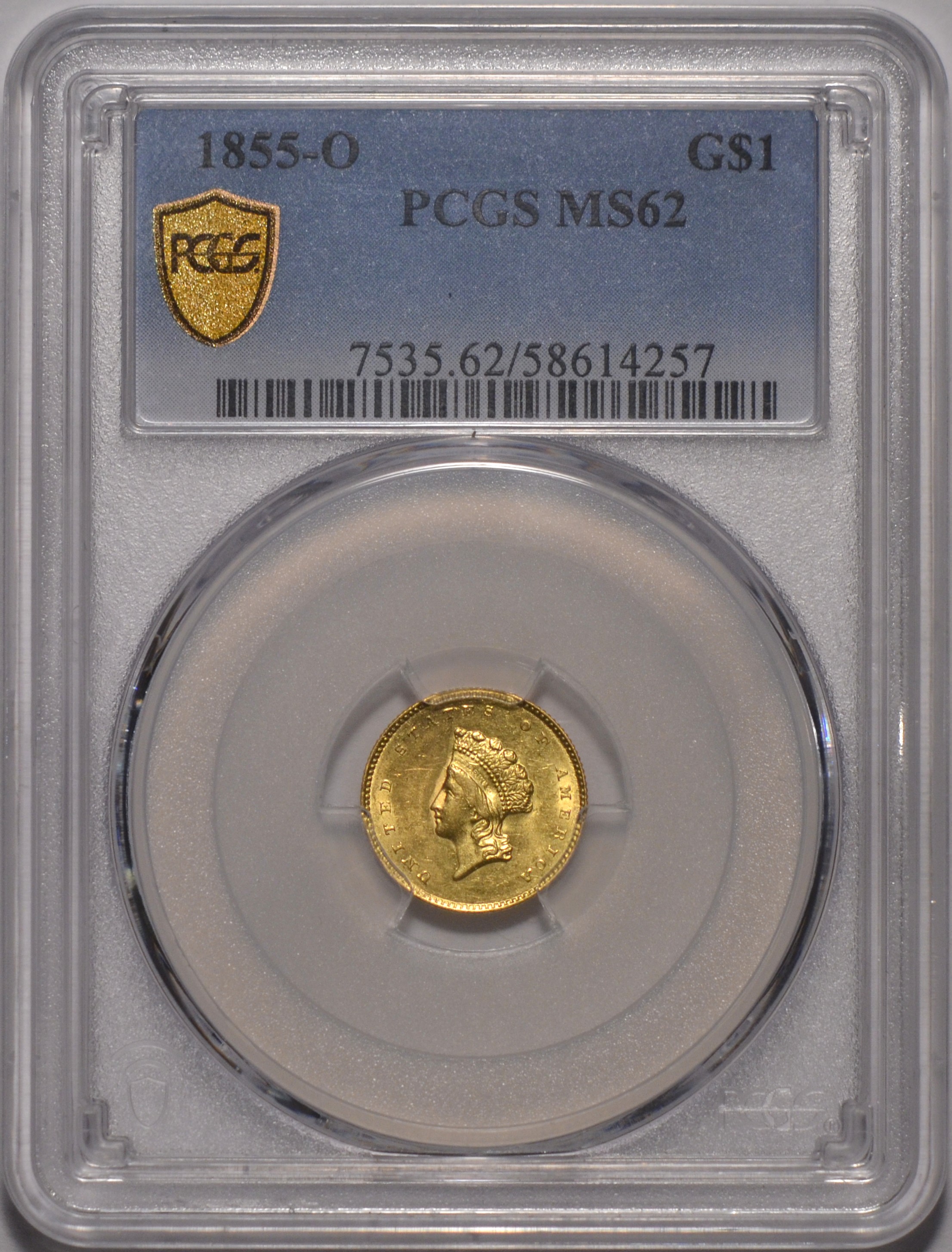 1855-O Gold $1 PCGS MS62 Crisp, lustrous Brilliant Uncirculated. Very scarce in Mint State. The sole Type II Gold dollar issue minted in New Orleans. Highly desirable as such.