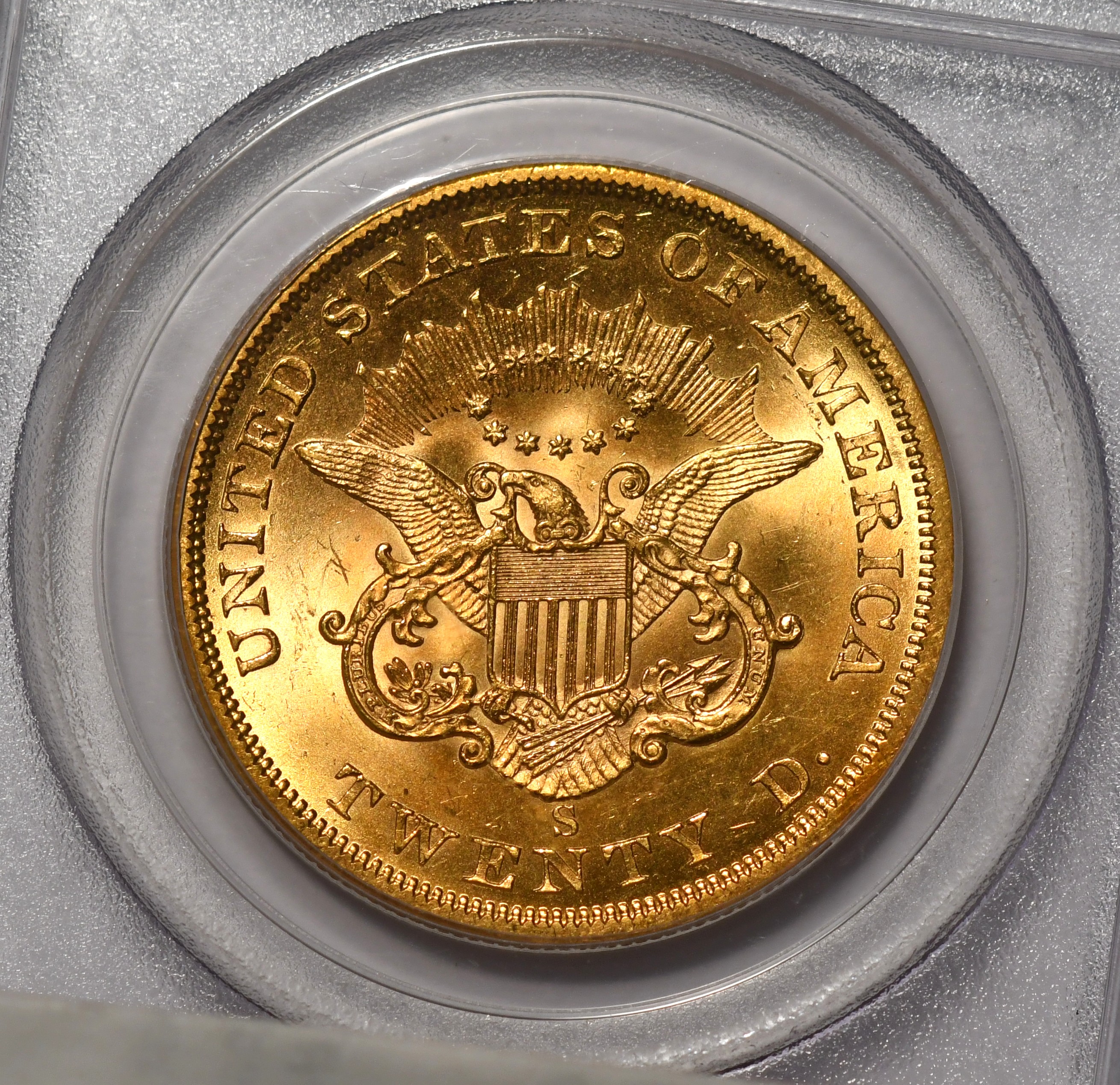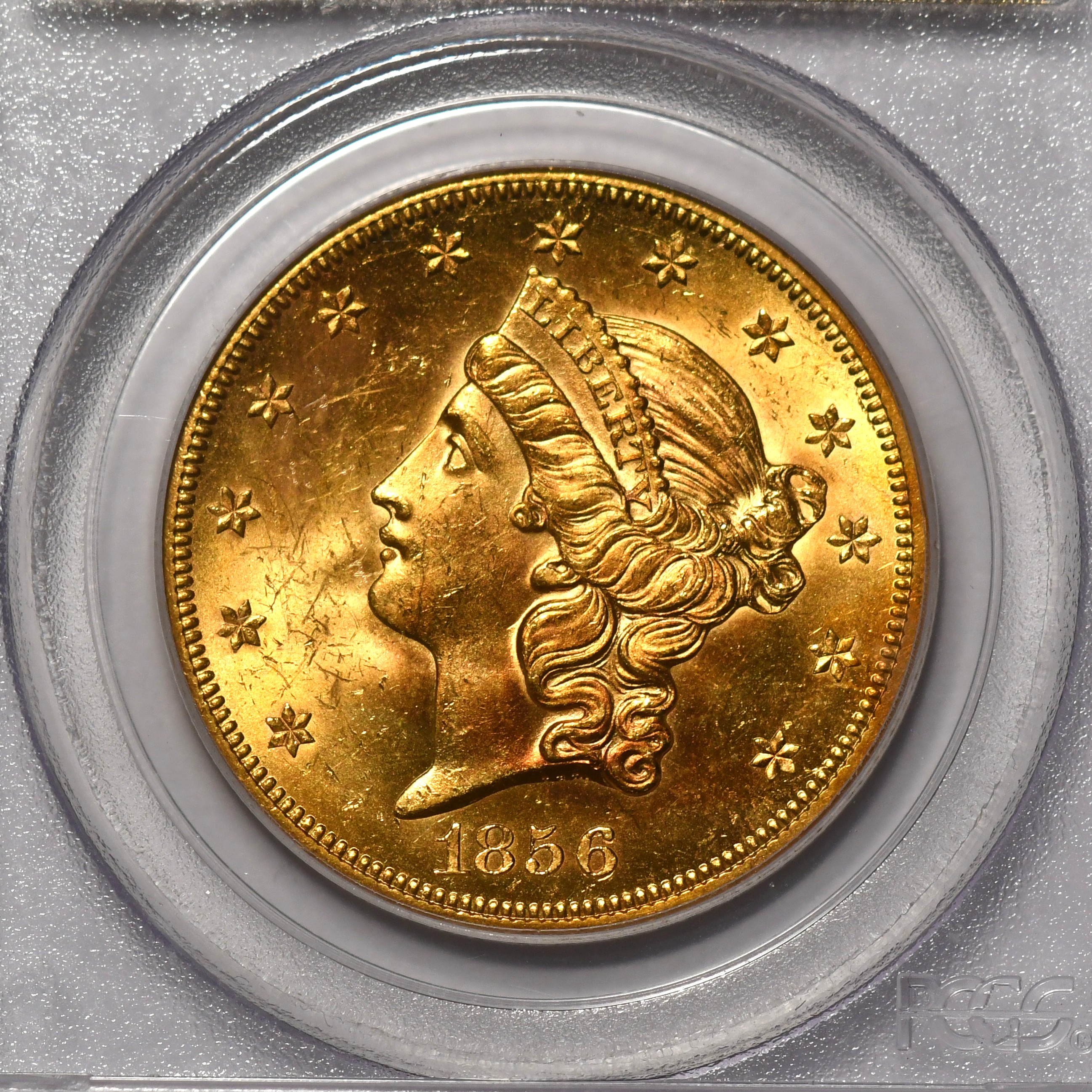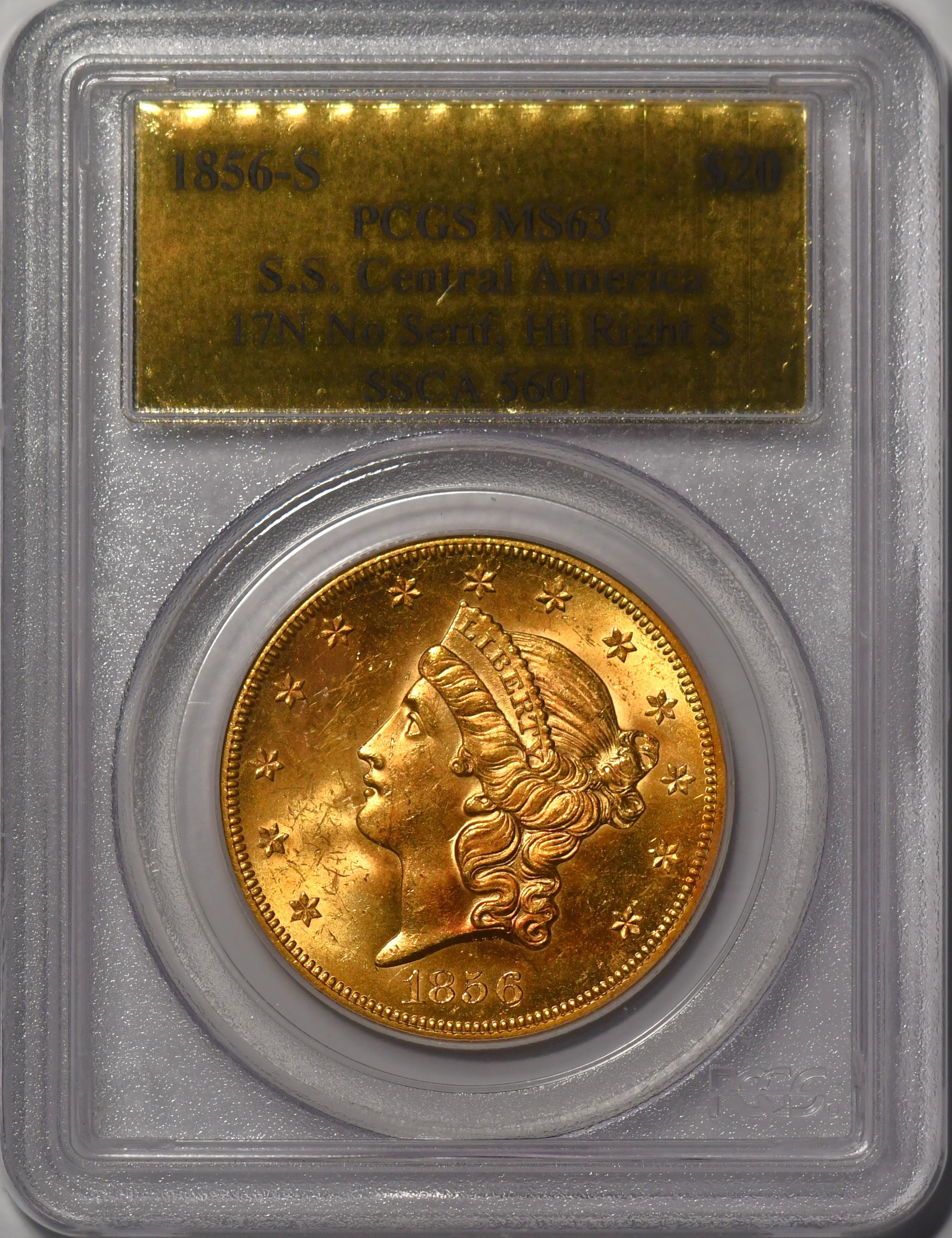 1856-S SSCA $20 PCGS MS63 1856-S PCGS Gold Label from the SS Central America shipwreck in very choice uncirculated MS-63 condition that has significant eye appeal and desirability. Considerably Tougher date in the series.