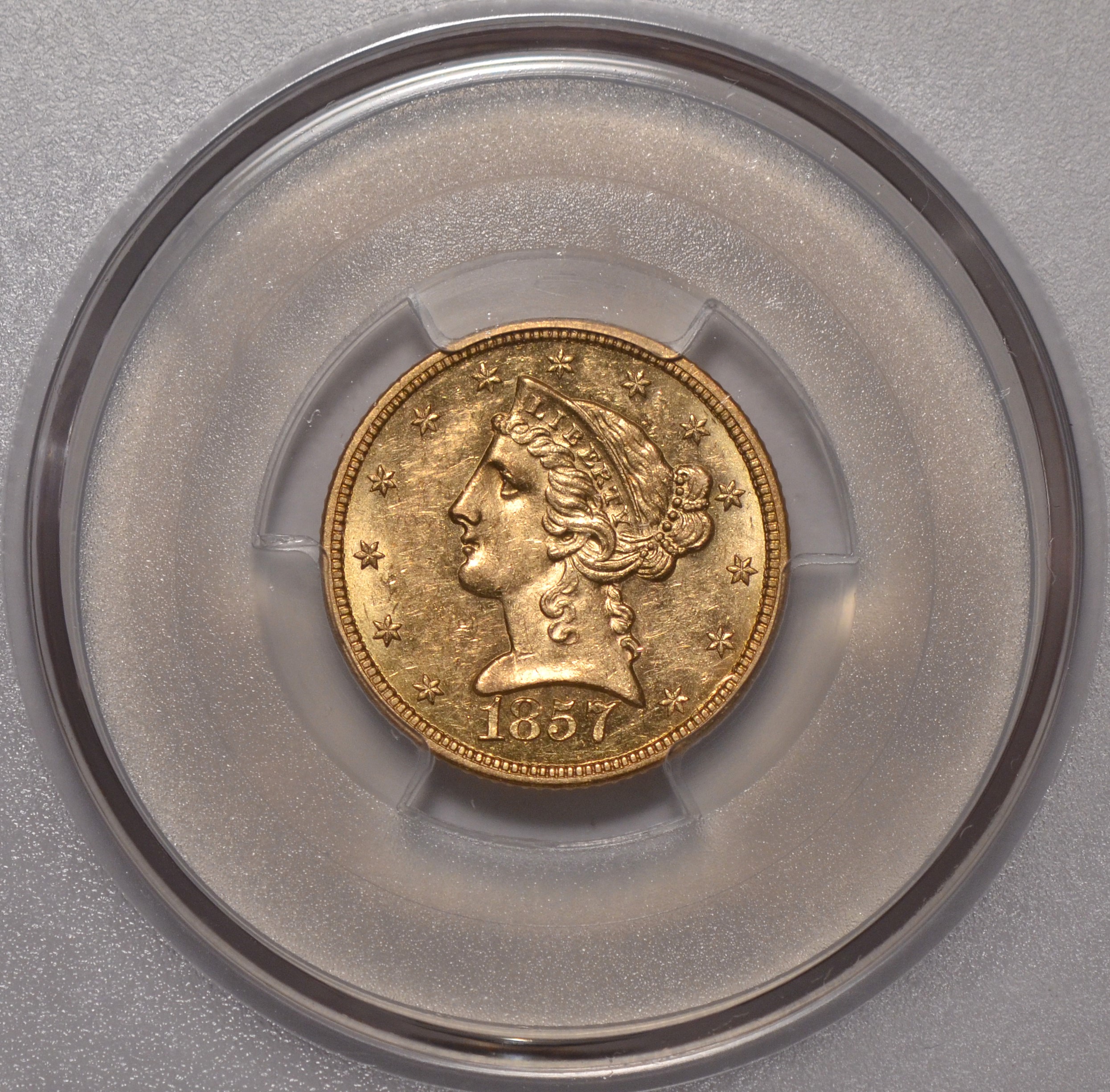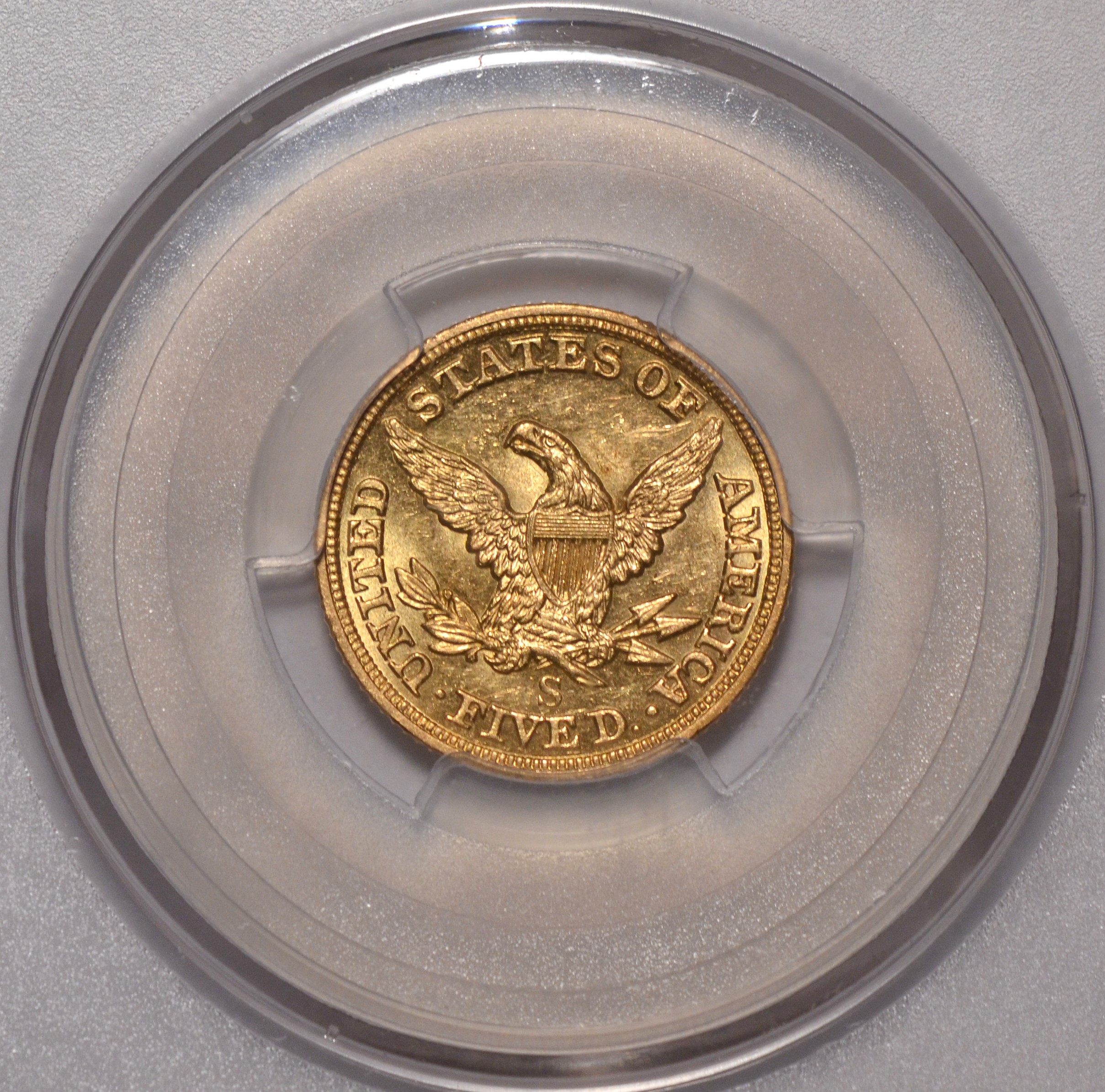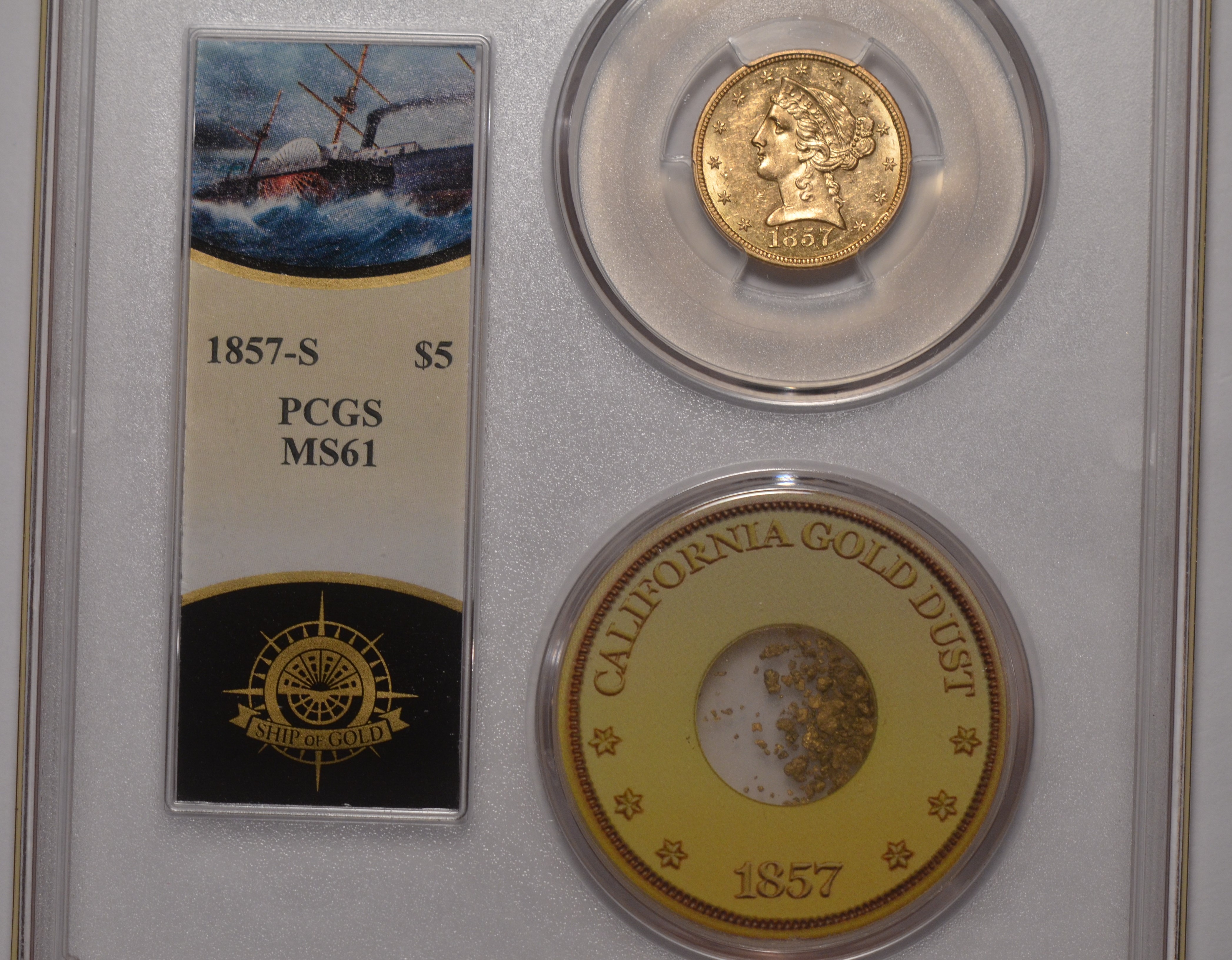 1857-S $5 PCGS MS61From the SS Central America 2 Shipwreck (w/ gold pinch)., this rare 1857-S half eagle is Sharply struck, lustrous & somewhat prooflike. Premium quality ( PQ ) and almost impossible to duplicate with very few brought up from Davey Jones locker making it even tougher to find this nice and pristine.