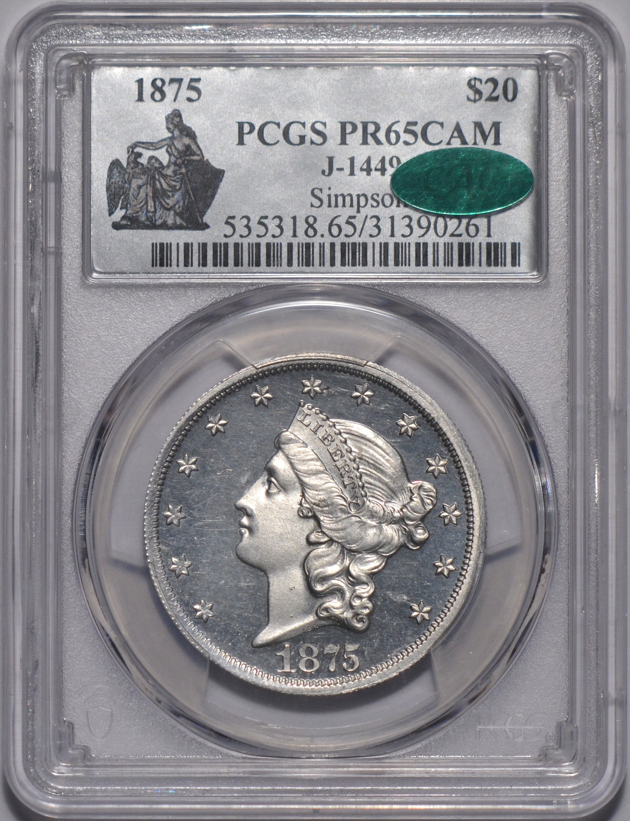 Two claimed to be known, per uspatterns.com. However this is the only one graded at either grading service. Incredible surfaces and near perfect in eye appeal, 34mm, Simpson pedigree and cac'd
