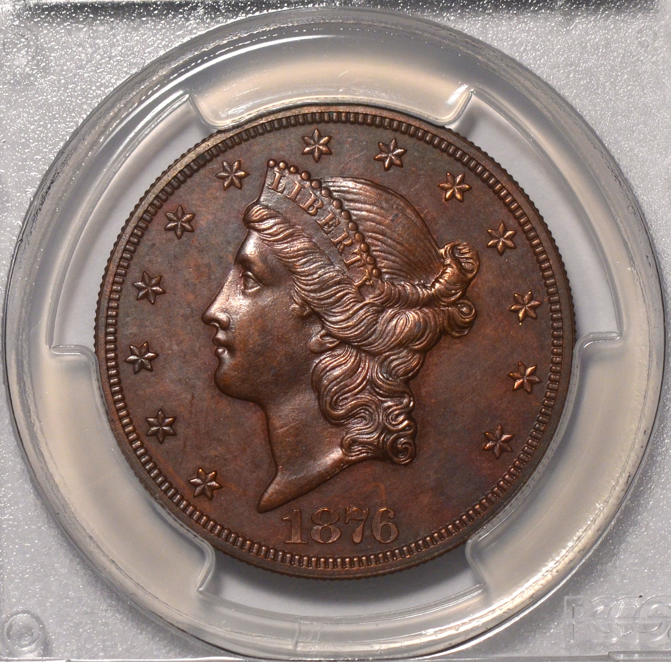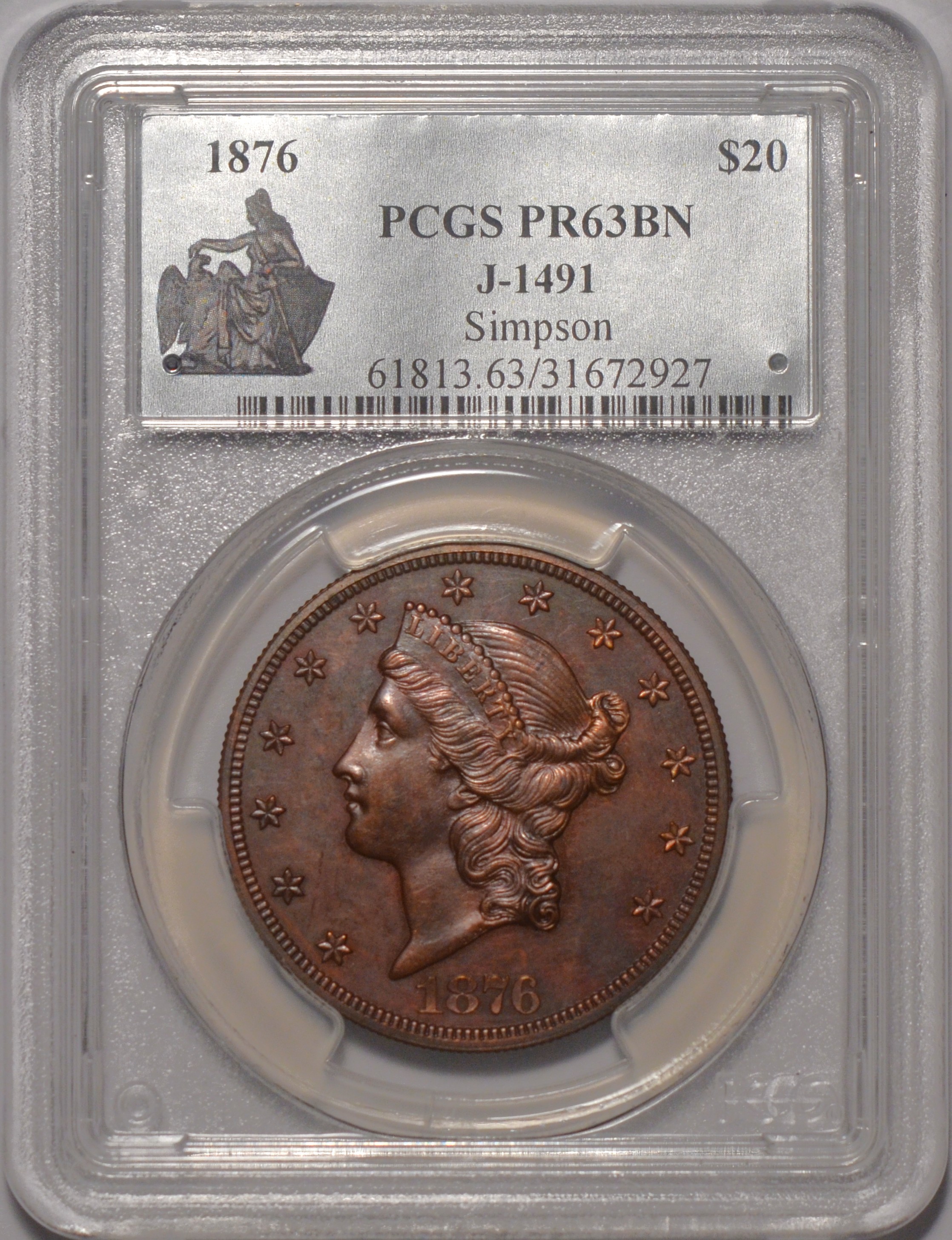 J-1491 $20 Patterns PCGS PF63 BN Amazing 1876 double eagle struck in copper from the famous Simpson Collection. R-7+. Rare Transitional in Copper. Judd=$30,000. Population only 1 with 1 higher at PCGS and only 1 in grade none better at NGC. A great rarity in double eagle patterns.