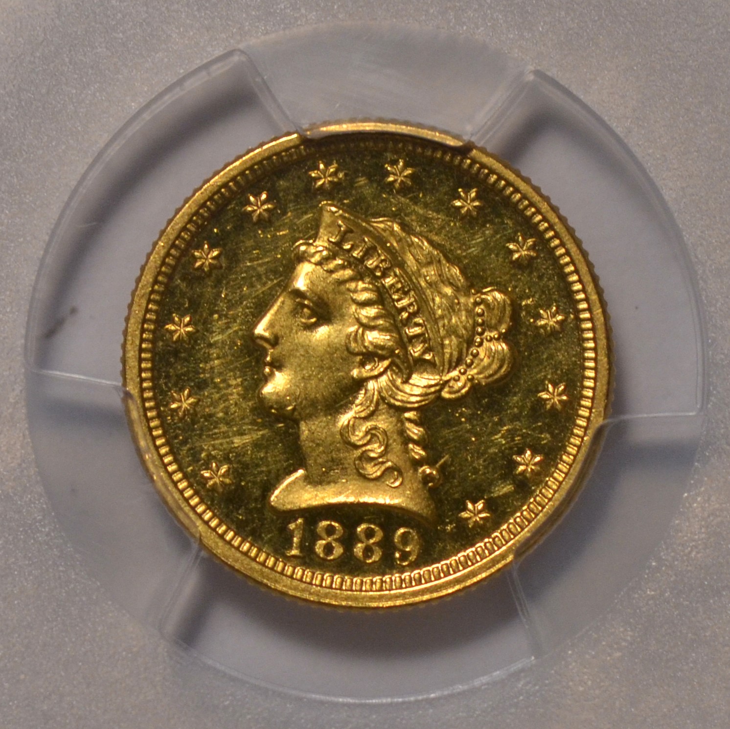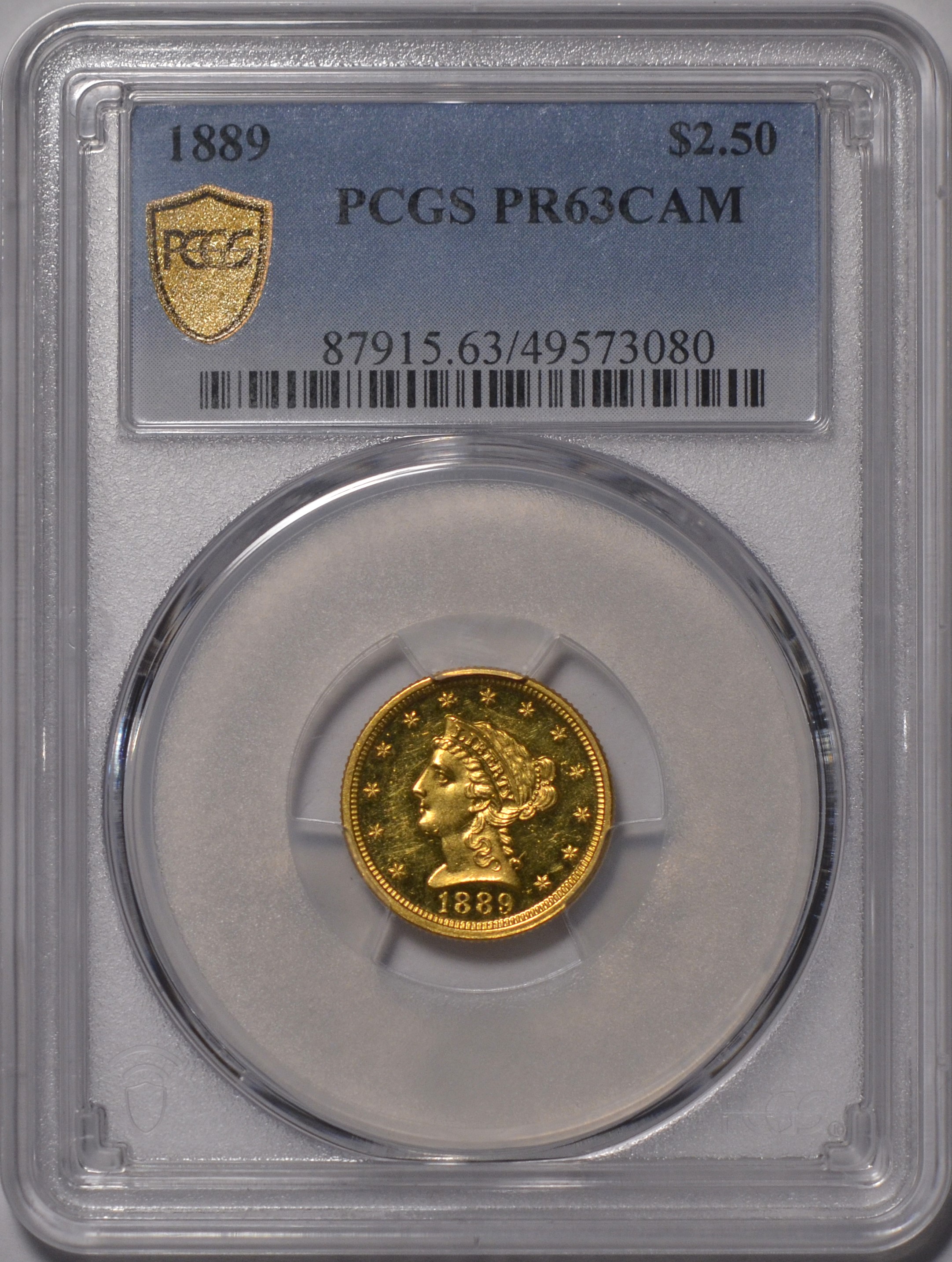 1889 $2.50 PCGS PF63 CAM Very pretty Cameo contrast on this rare proof gold quarter eagle of 1889. Looking thru inventory, I was looking to see if we could assemble a gold proof set and lo and behold I do believe we can get really close in one fell swoop. Only 48 proof gold quarter eagles were minted this year making this a rare date in all of proof gold various series.