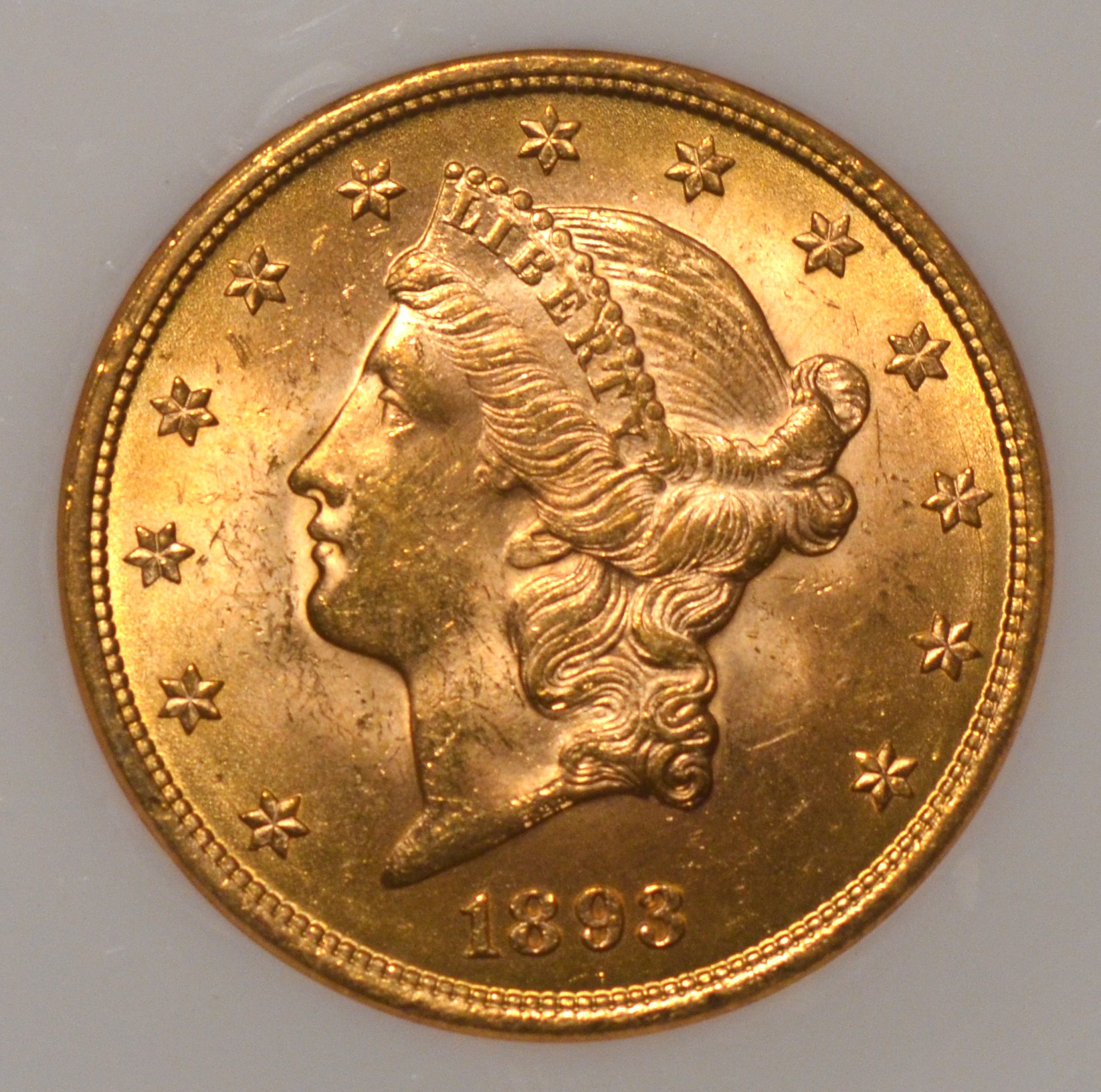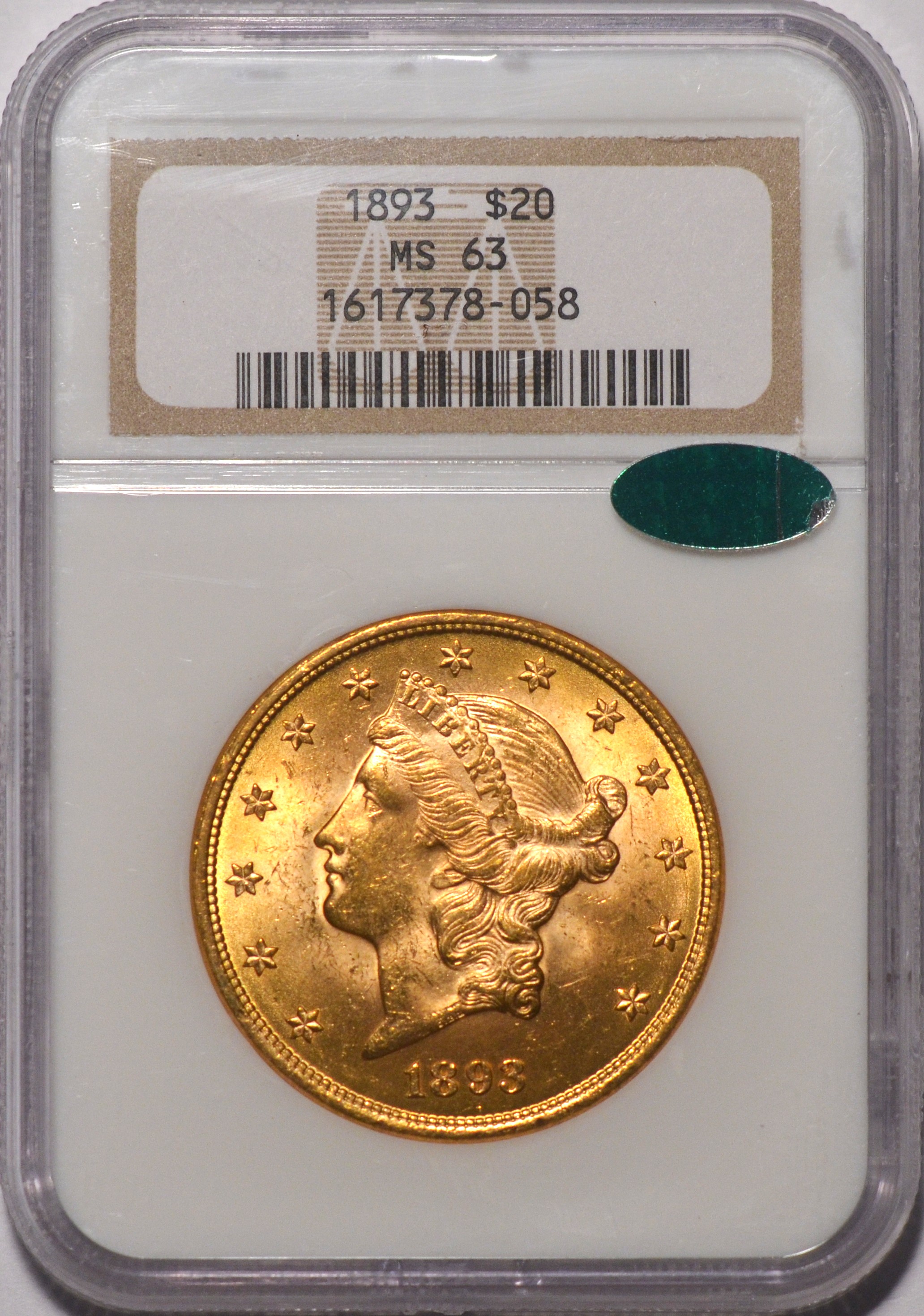 1893 $20 PCGS MS63 CAC Beautiful very choice brilliant uncirculated 1893 double eagle in NGC MS-63 CAC. If you put a piece of black tape over the grade and pass this coin around to others, most will call this coin MS-64 and rightfully so as this coin is top of the grade in every aspect.
