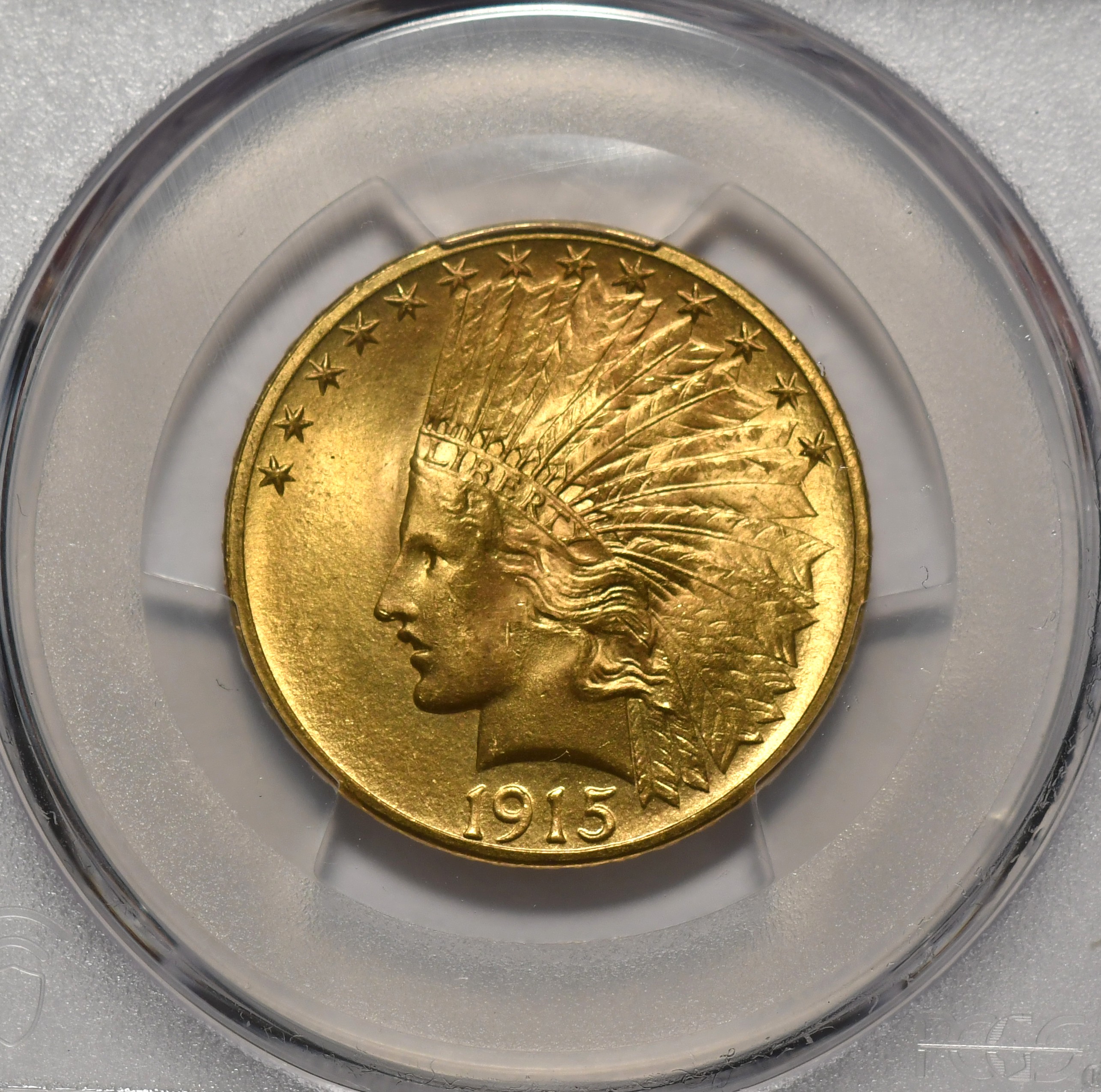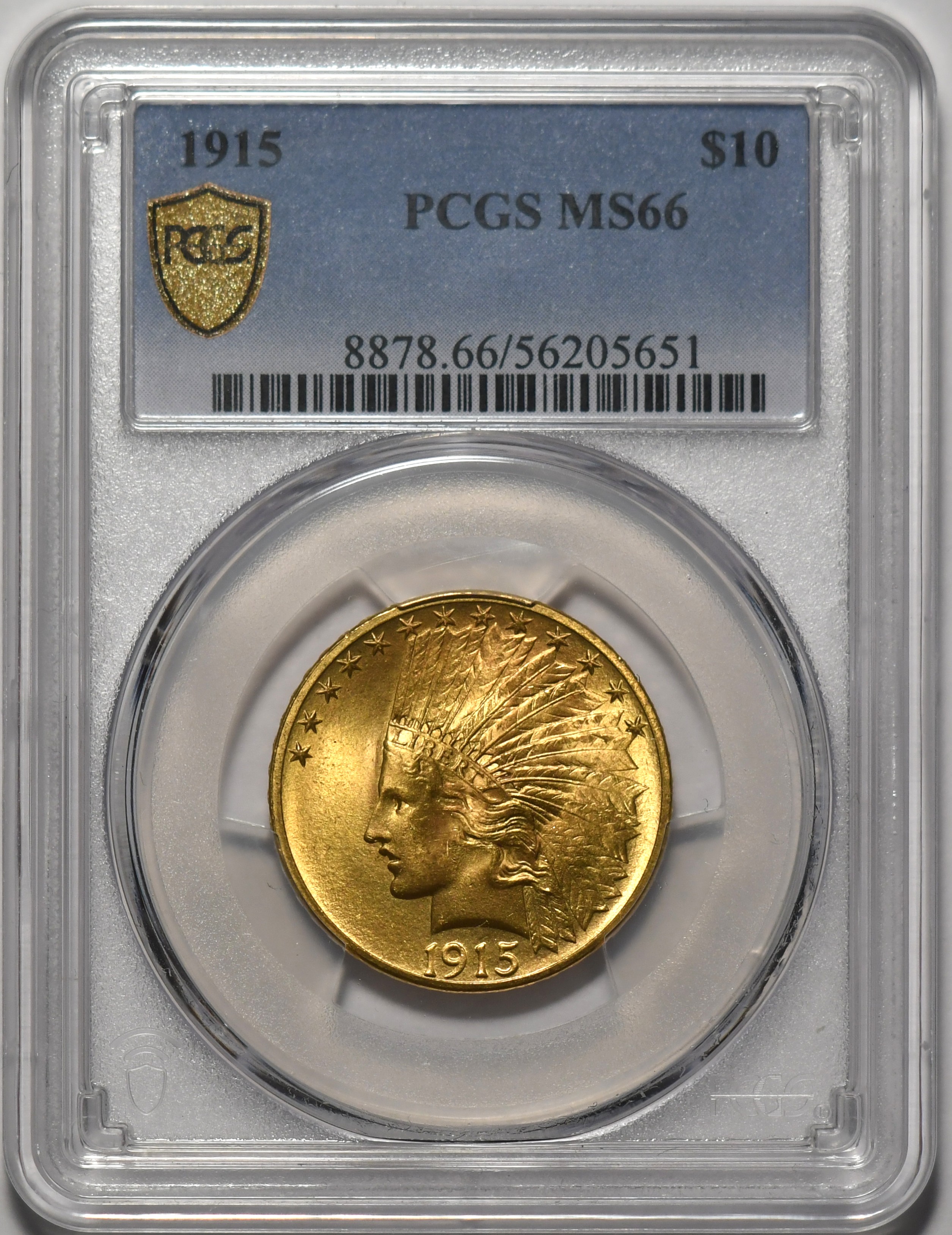 1915 $10 PCGS MS66 Superior gem quality PCGS MS-66 1915 Indian Gold. Lovely gem, w creamy luster. PCGS shows $35,000 and a population of only 19 with a mere 2 coins graded higher at PCGS.