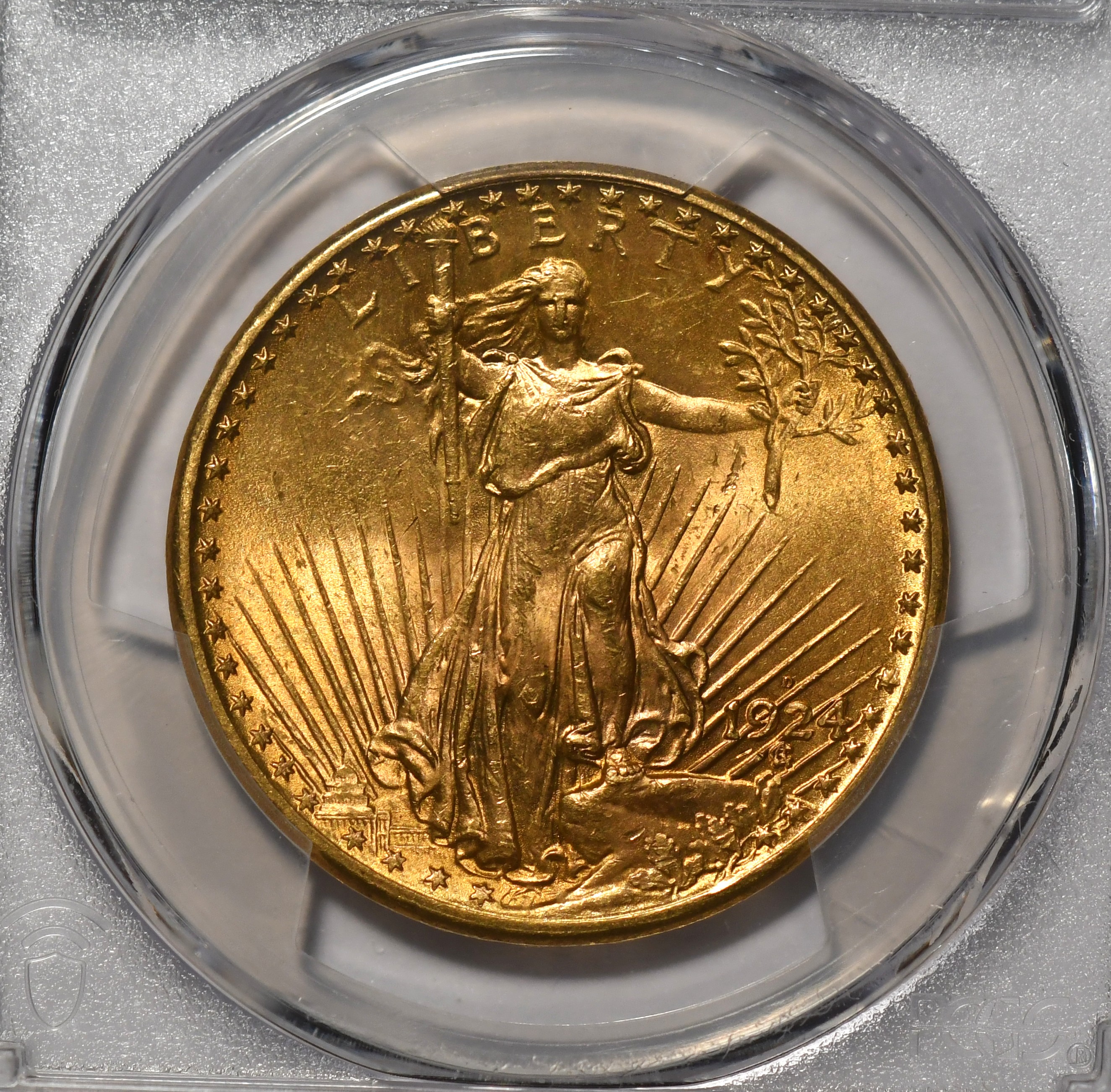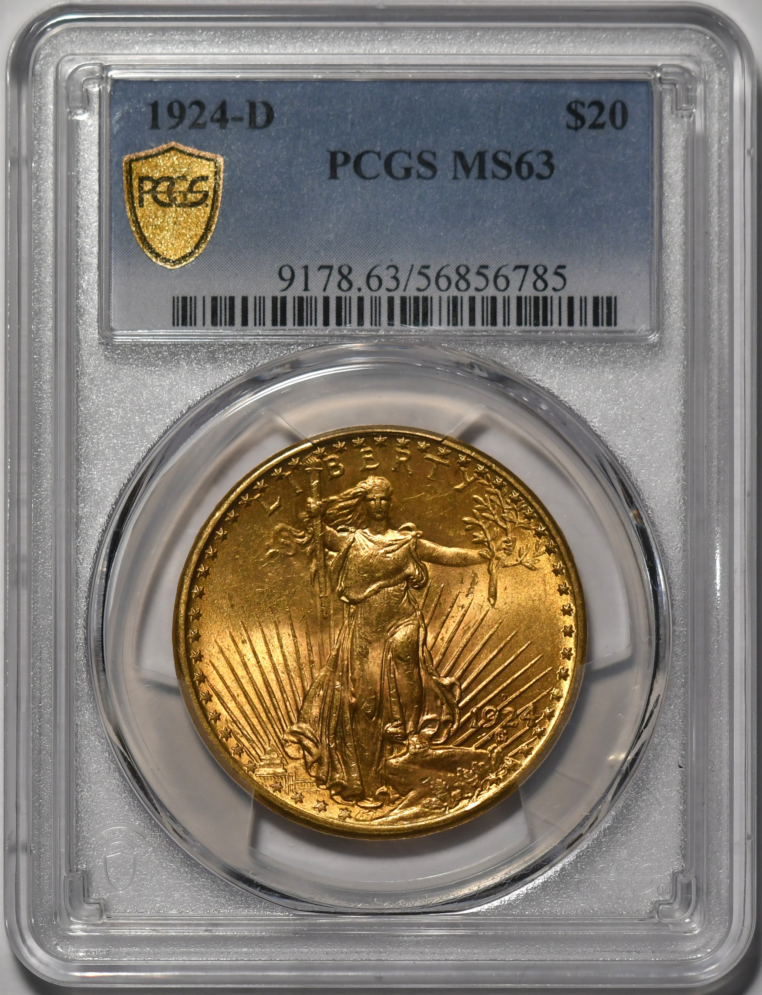 1924-D $20 PCGS MS63 Scarce latter-day Saint issue with lovely surfaces and excellent strike.
