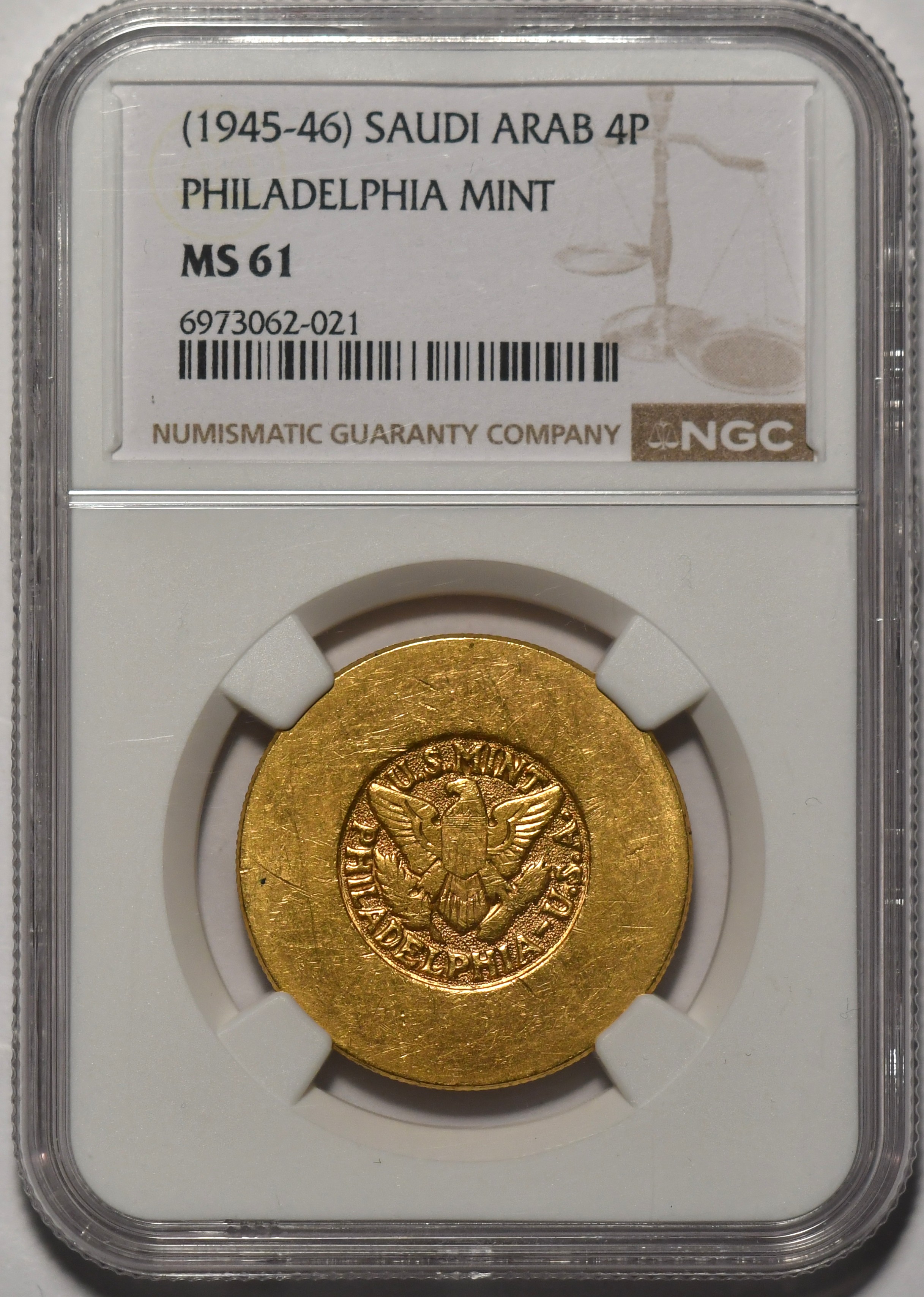 1945-1946 4 Pound Saudi Arabia NGC MS61 KM-34. Struck at the Philadelphia mint to pay for oil rights. Mintage 91,000,Net weight 452 grains, equivalent to 4 British sovereigns.
