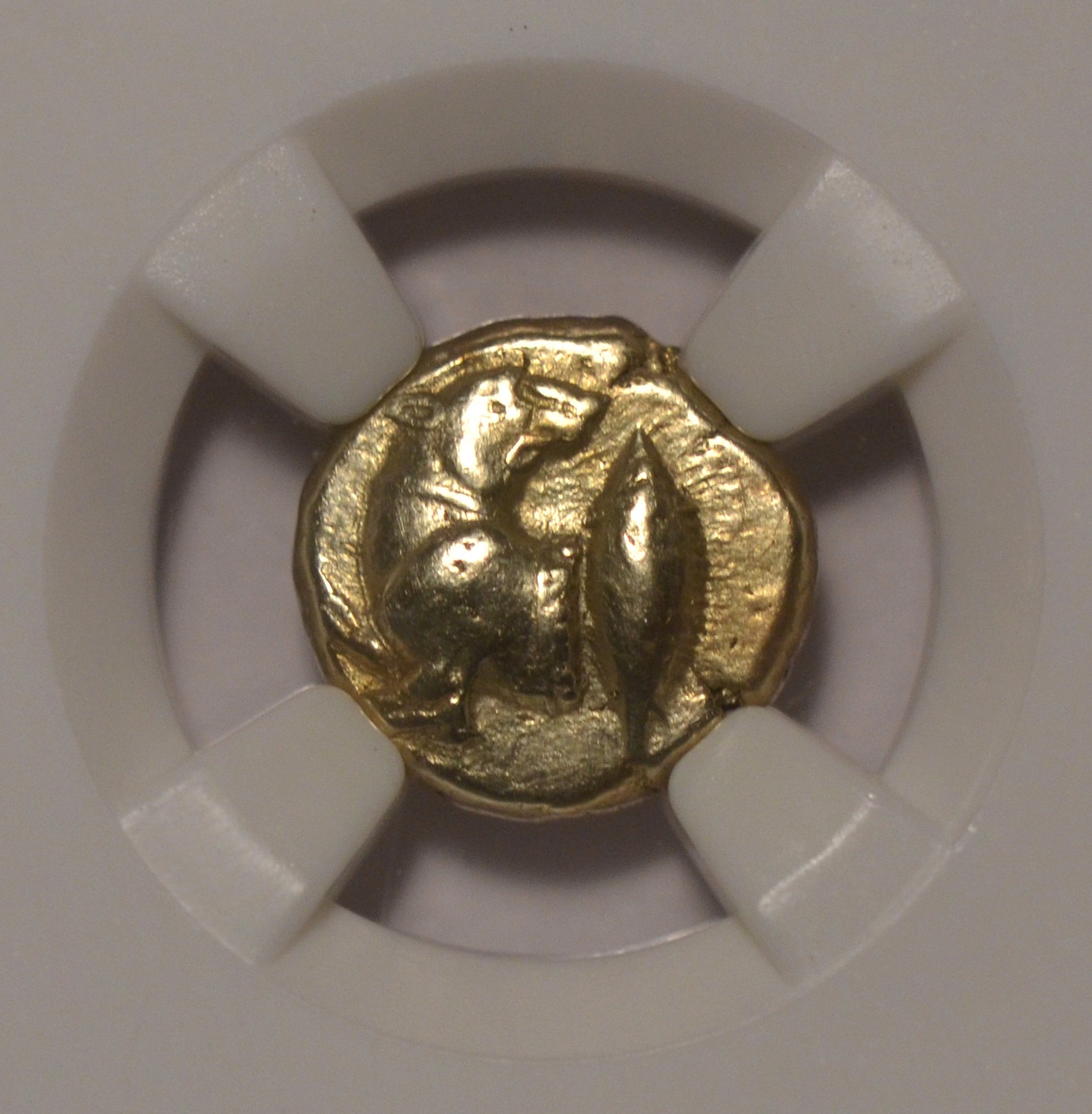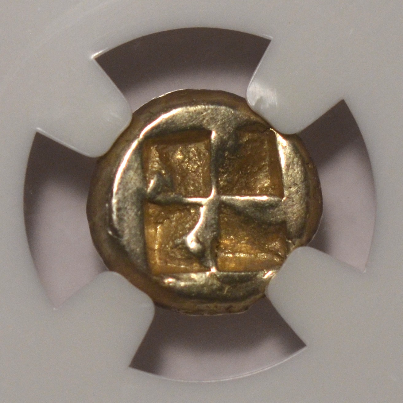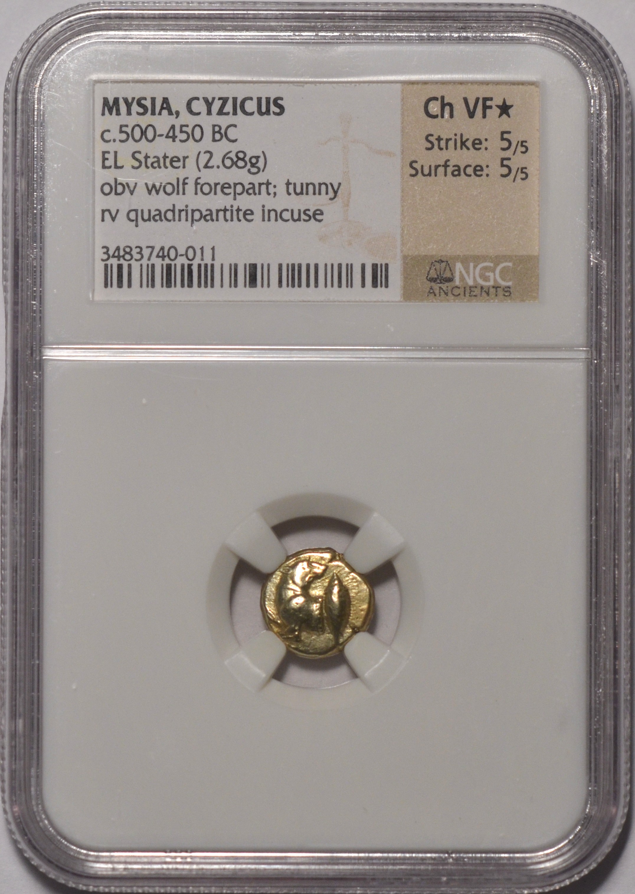 Cyzicus Gold Stater Ancients NGC Ch VF* Mysia. 500-450 BC, part of ancient Asia Minor now part of Turkey. 2.68g. Star-designated for exceptional eye-appeal. Strike 55, Surface 55. Obverse features wolf forepart, tunny. Reverse features quadripartite incuse.