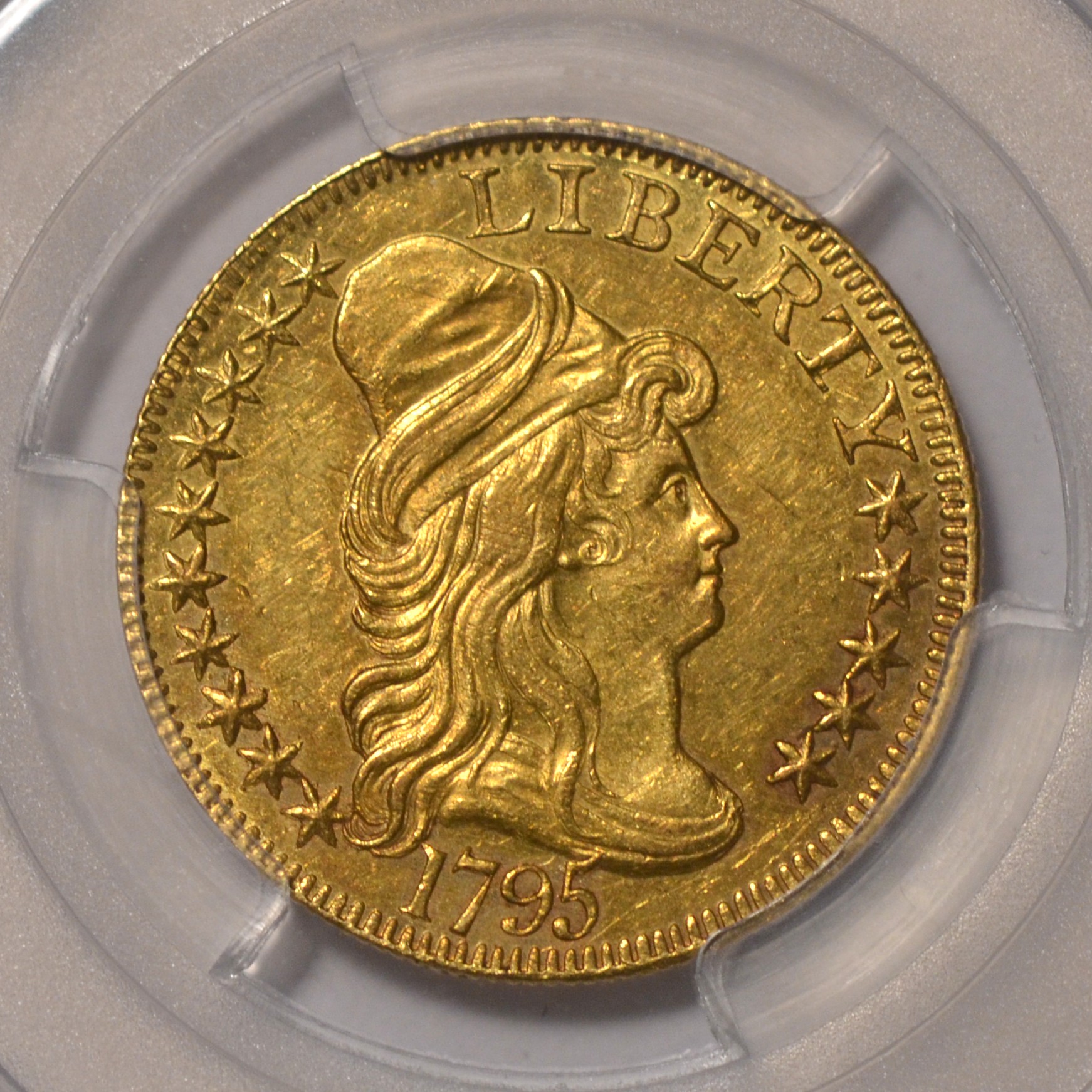 1795 Small Eagle $5 PCGS MS61 Monumental rarity and desirability is shown by this first gold coin issued by the United States Mint which struck gold 1795 half eagles first followed by Eagles in 1795. Present specimen in uncirculated condition and choice in that respect, BD-9, R-5+. Crisply struck. Lovely (unlike many dogmeat comps like the MS61 that recently sold in auction). Evergreen 1st year of issue. PCGS shows $130,000