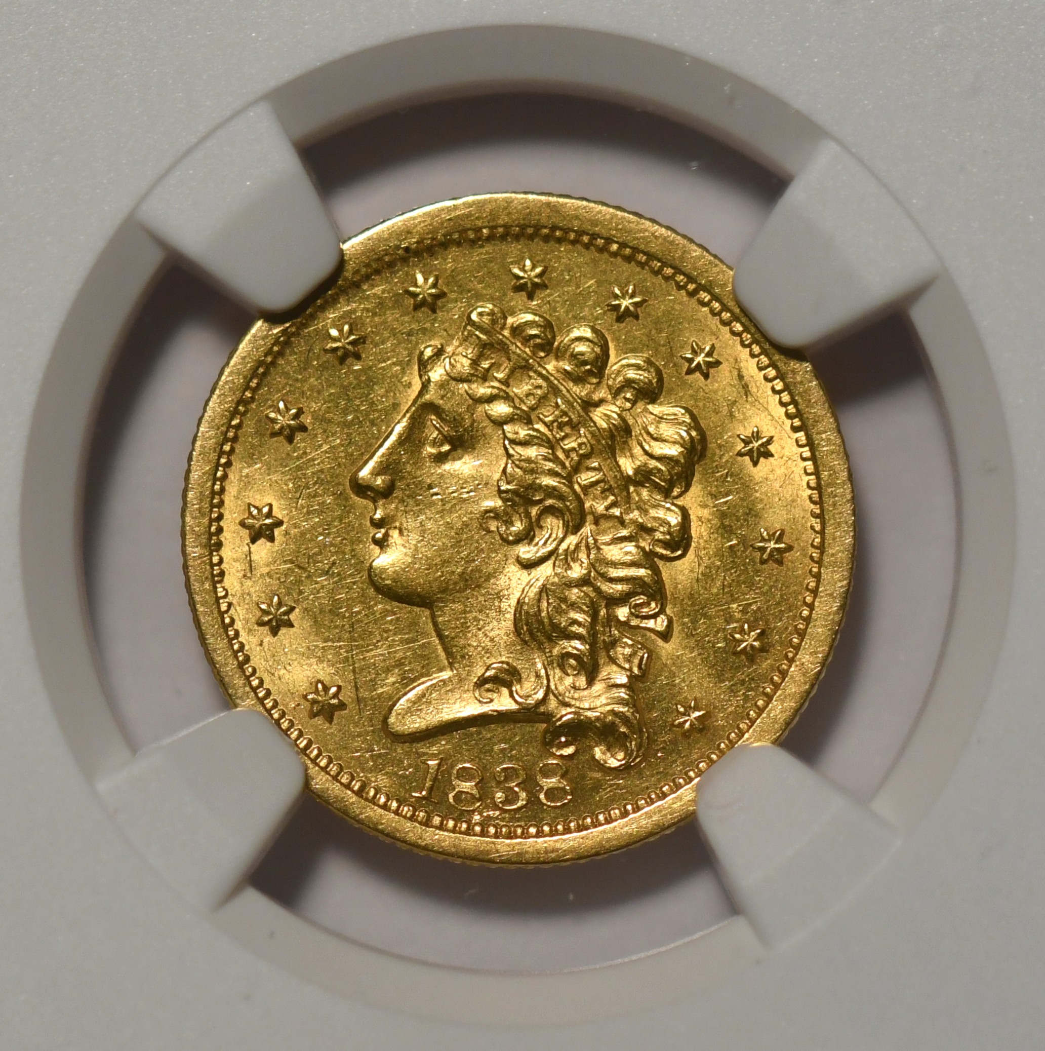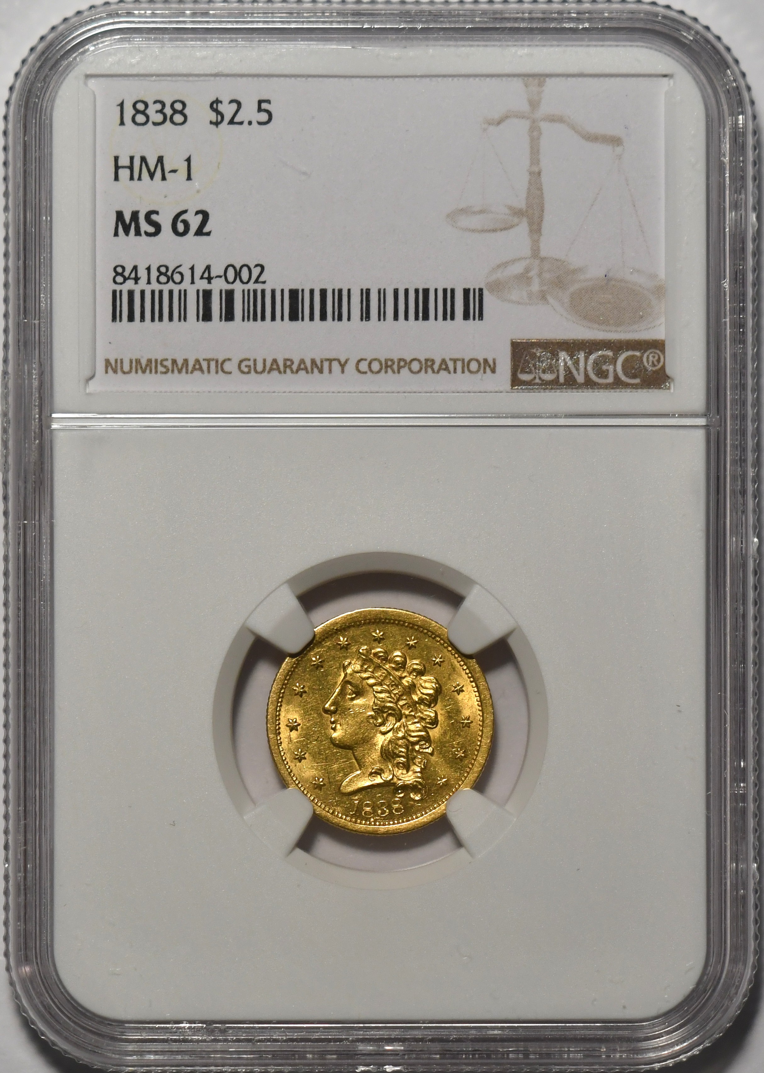 1838 $2.50 NGC MS62  HM-1. Crisp & lustrous. Scarce Classic Head issue. PCGS $7500.