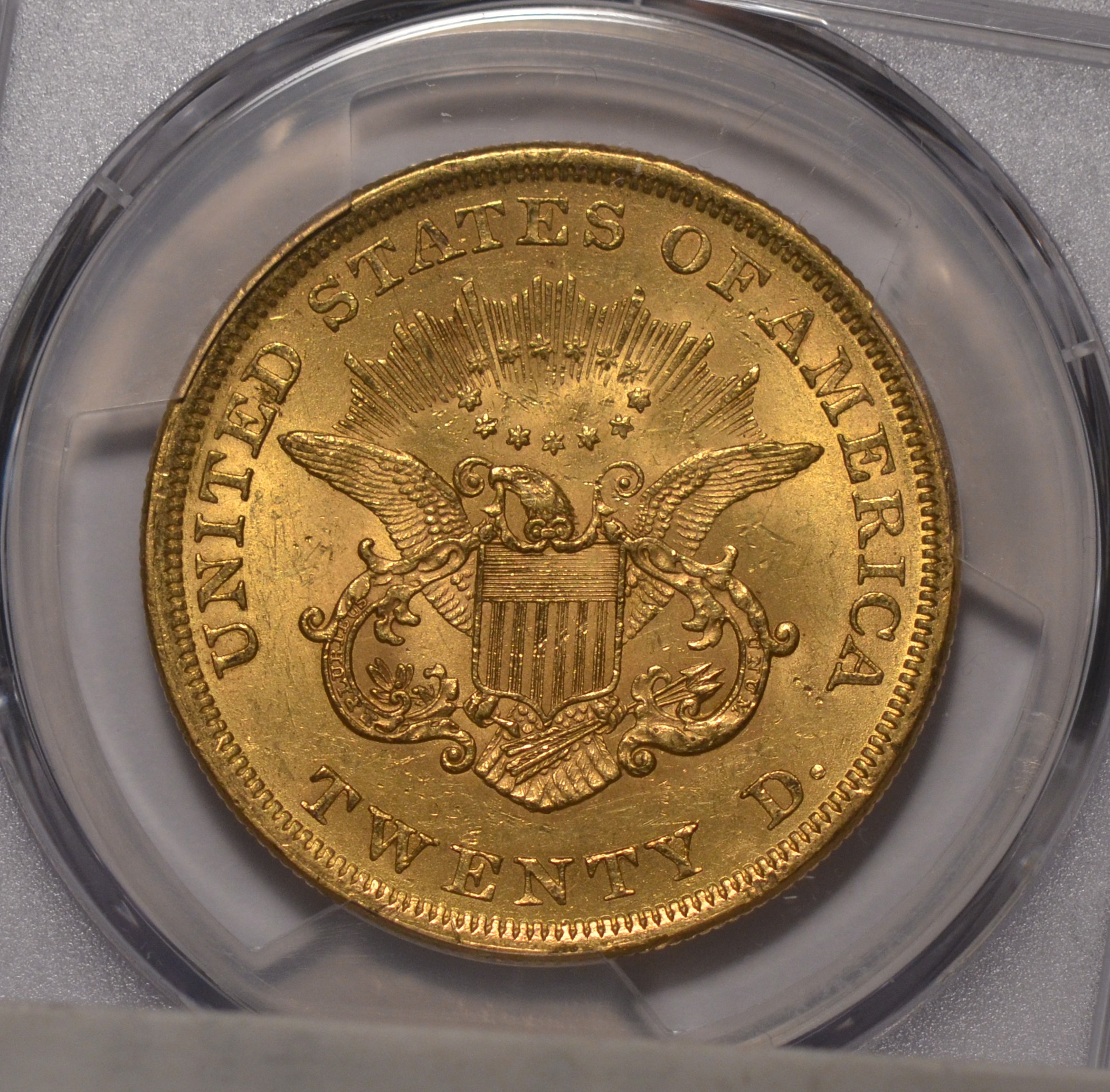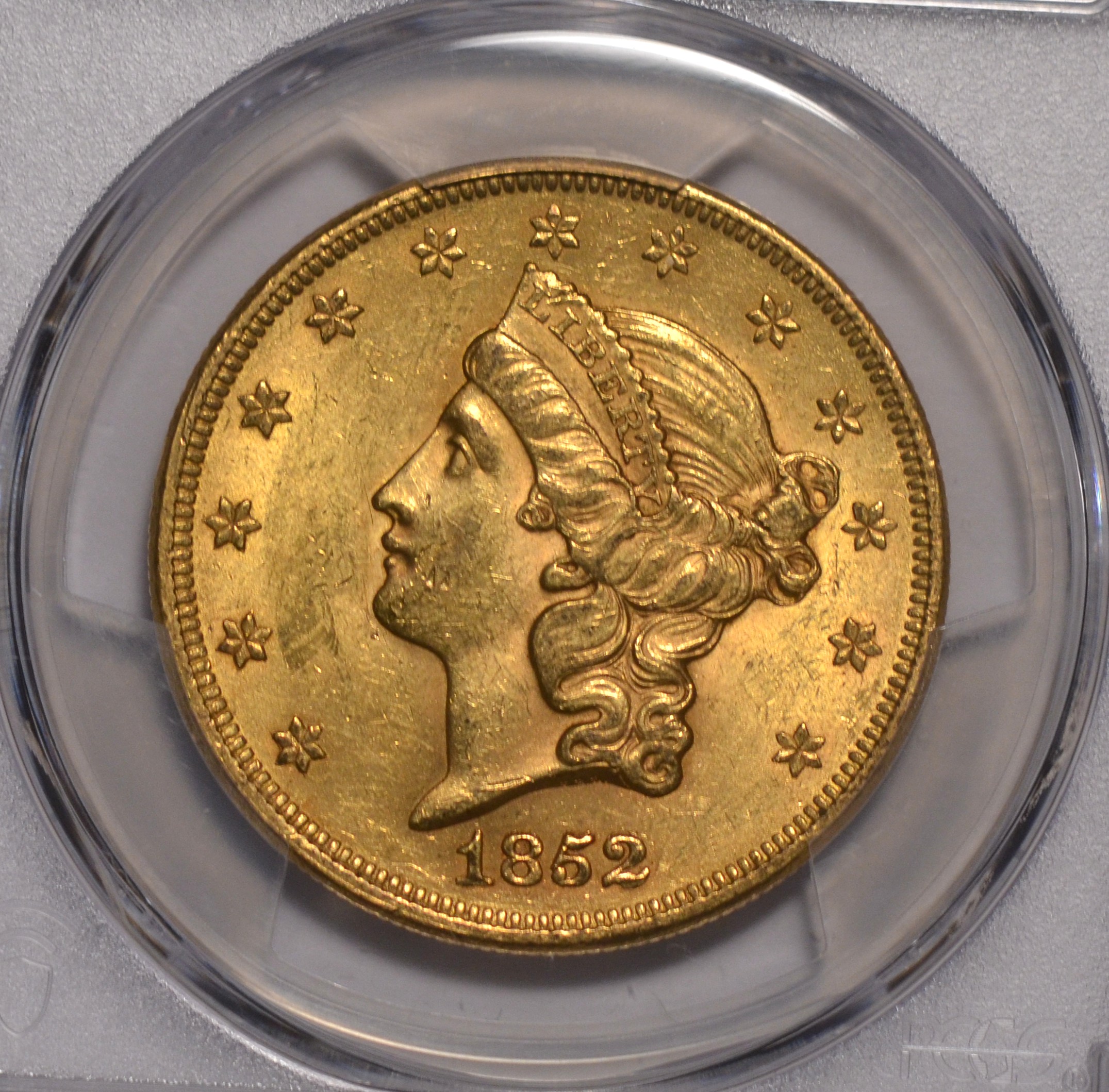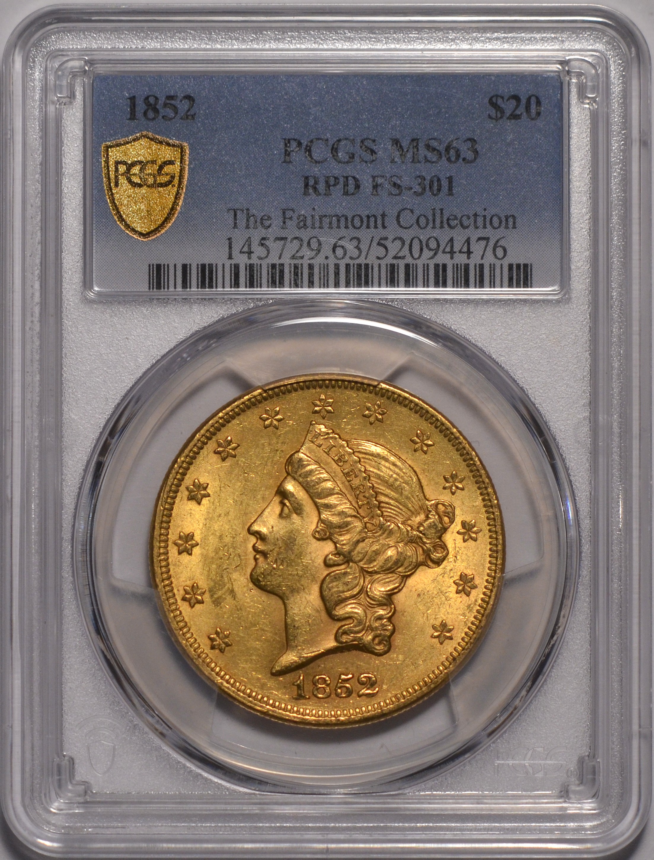 1852/1852 $20 1852/1852 Double Eagle PCGS MS63 PCGS MS63FS-301. RPD. Incredible, original, crisp lustrous surfaces. Tied for finest known of the variety. Ex-Fairmont collection. Exceptional strike and luster double eagle gold rarity. PCGS shows $37,500