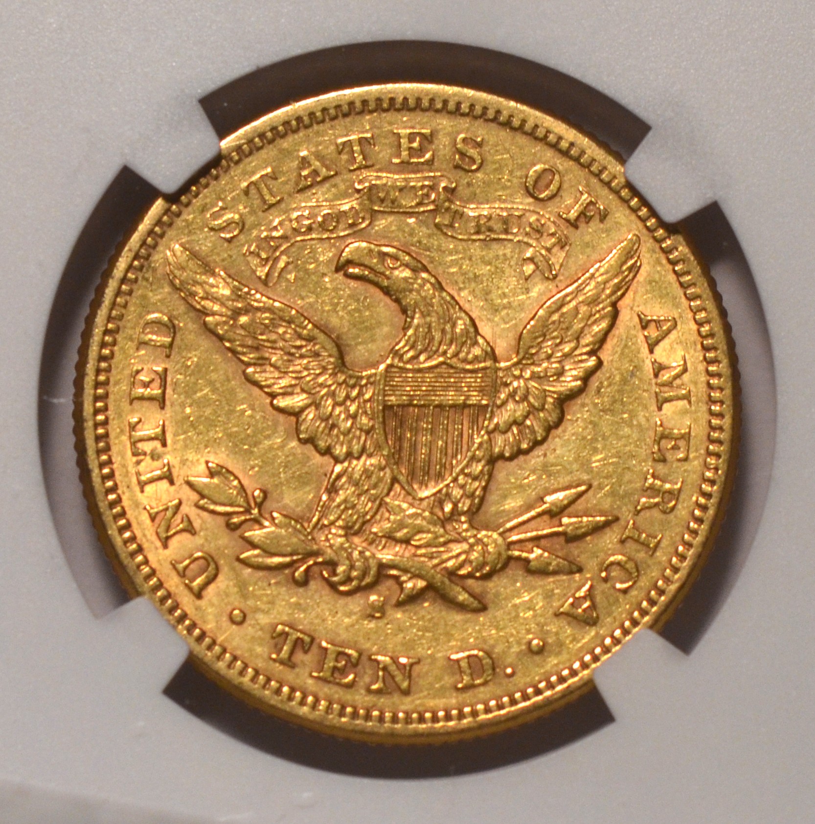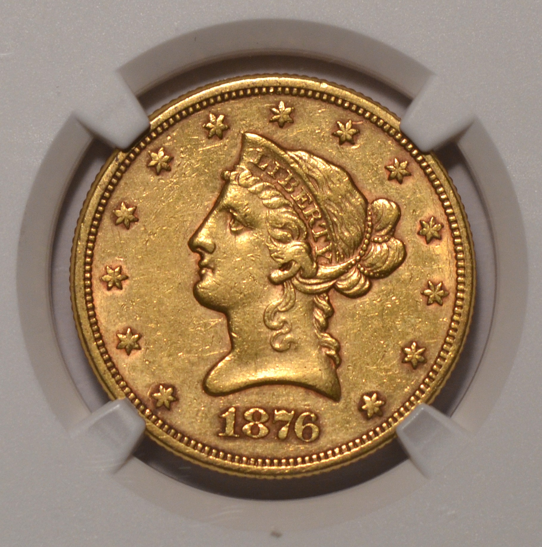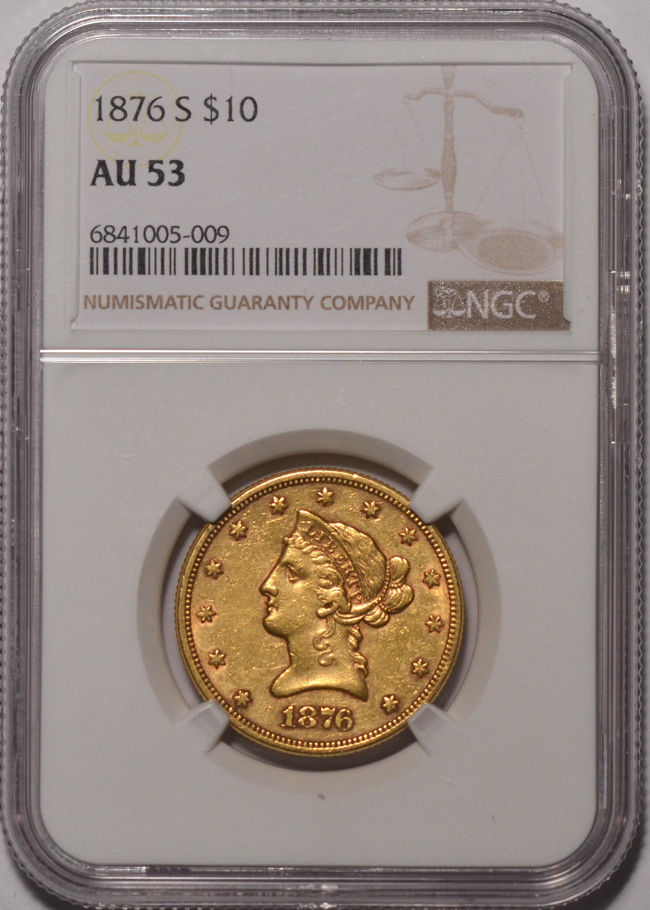 1876-S $10 NGC AU53 Very scarce gold eagle from the west coast. PCGS estimates only 80 to 100 survivors in all grades. This specimen shows sharp strike and wholesome surfaces.