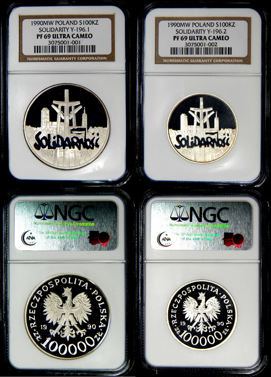 1990MW Solidarity Y-196.1 Poland S100KZ NGC PR69UCAM. 1990MW Solidarity Y-196.2 Poland S100KZ NGC PR69UCAM. 1990MW Solidarity 100,000 Zloty Silver. A genuinely rare and historic Polishcoin. Y-196.1, 31.1000g, 0.9990 Silver, 1.000 Oz. The 10th Anniversary ofSolidarity movement which greatly help signal the end of communism and foreignrule in Poland.