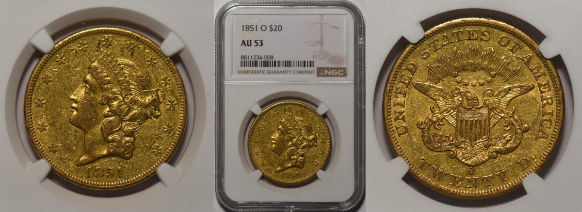 double eagle 1851-O in choice about uncirculated condition that is