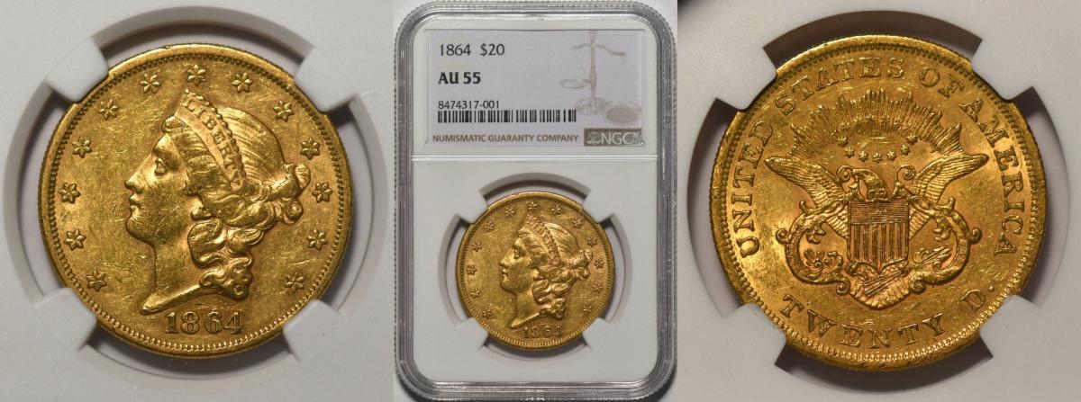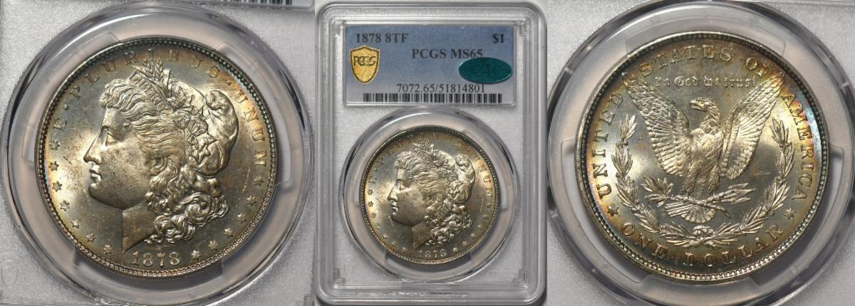 This weeks hand picked offerings begin with an ever popular and gem condition 1878 8TF Morgan Dollar in PCGS MS-65 CAC, next up a rare low mint state Proof Morgan dollar of 1890 with original "spotlight" toning to the first of several gold treasures starting with an early gold dollar of 1852-O from the Big easy in very choice uncirculated MS-64, to a choice uncirculated condition census 1888-S half eagle in choice unc showing only 2 coins graded higher, next up a very choice uncirculated 1856-S Double Eagle from the SS Central America in PCGS MS-63 followed by a monster Civil War Date 1864 Double Eagle in Choice About Uncirculated 55 by NGC, to a rare 1891-S/S Double Eagle Tied For Finest of only 7 graded, to a monster 1924-D St Gaudens PCGS MS-63 followed by a superb gem Colombia 1834 8 Reales NGC MS-65
