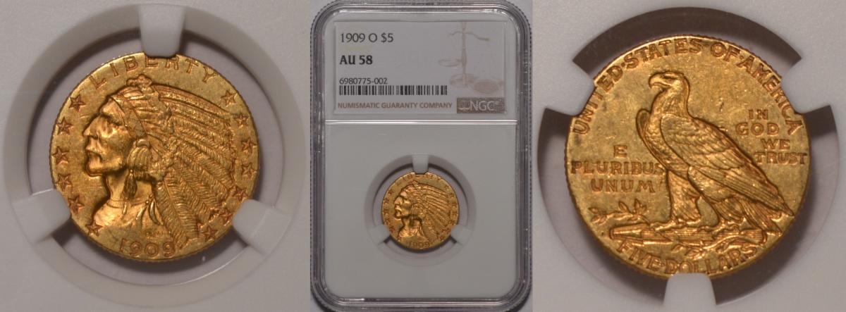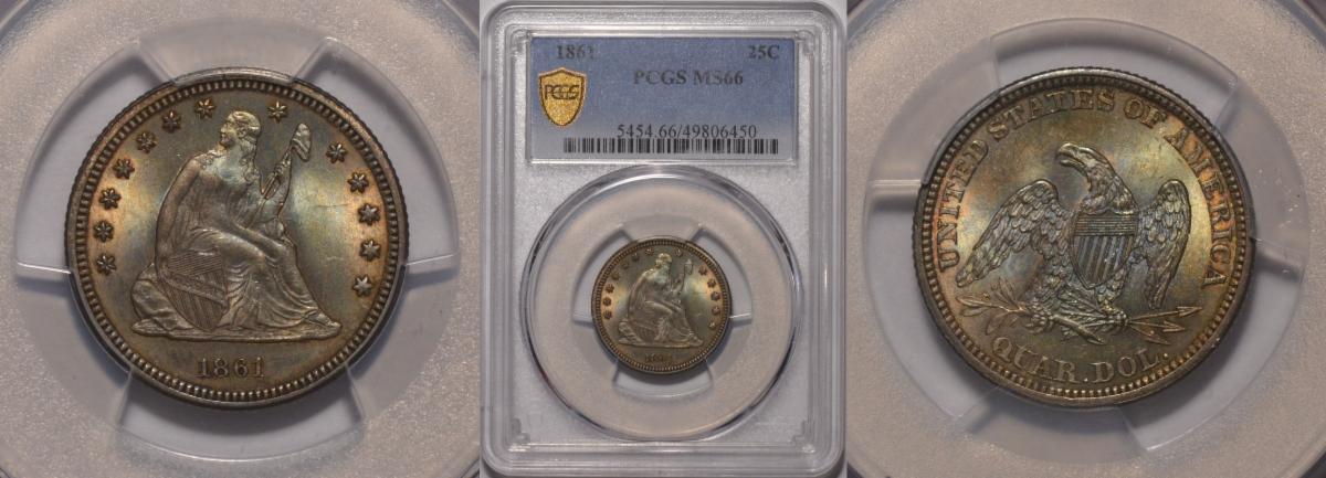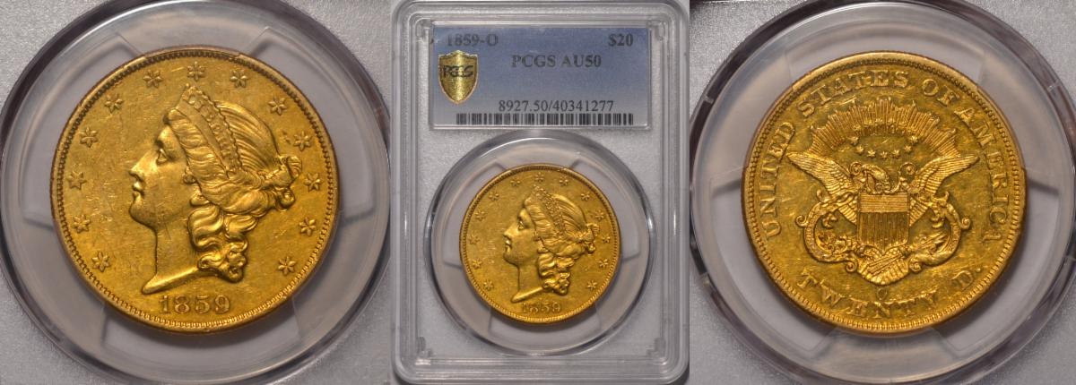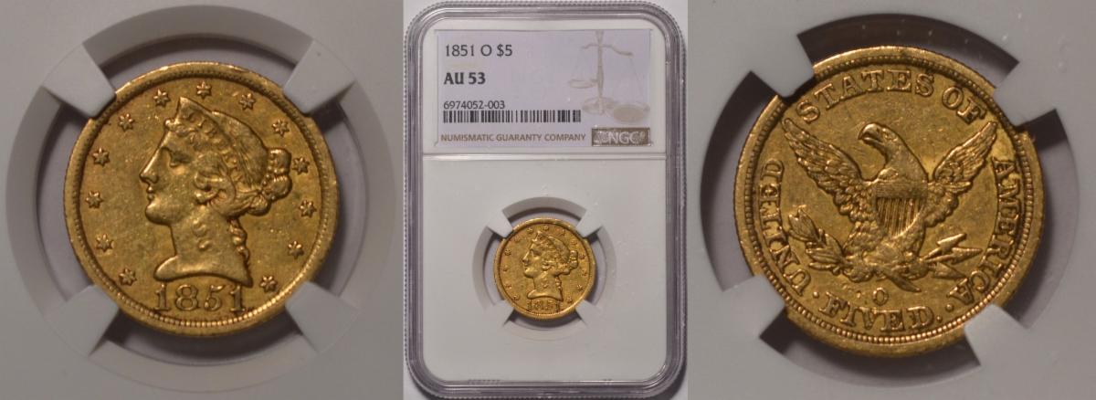 This week begins with an absolutely gorgeous 1851 Civil War dated Seated Quarter with absolutely knock out beautiful toning, on to the first of a number of great gold coins with this early half eagle dated 1851-O from the Big Easy in choice about uncirculated condition followed by the ever popular and always sought by collectors and sole $5 Indian struck in New Orleans, the 1909-O that is also quite colorful for a gold coin and desirable as such in very choice about uncirculated AU-58, next up 1887-S Gold Eagle in near gem MS-64 followed by yet another near gem eagle 1905-S also in MS-64 over to the 4th rarest New Orleans Minted Double Eagle of 1859-O About Uncirculated AU-50 by PCGS, to a very inexpensive 1873 Double Die Obverse double eagle and lastly a neat Mexico 8 Escudo Gold of 1820. More inventory of course can be found in the coins for sale section of the website but these are a few of this weeks highlights and special offerings.